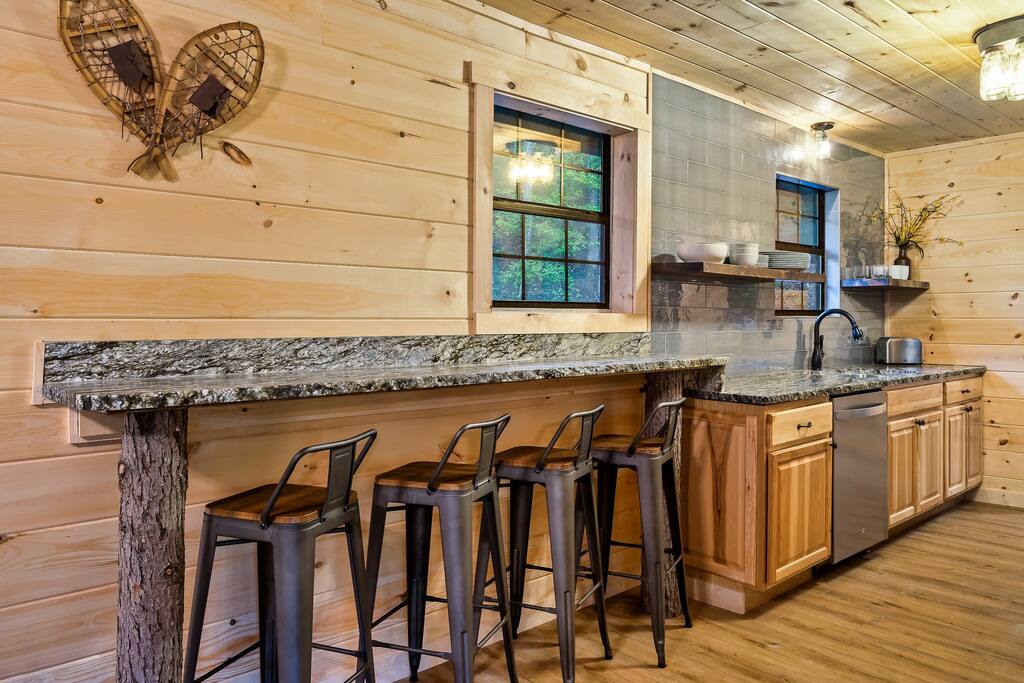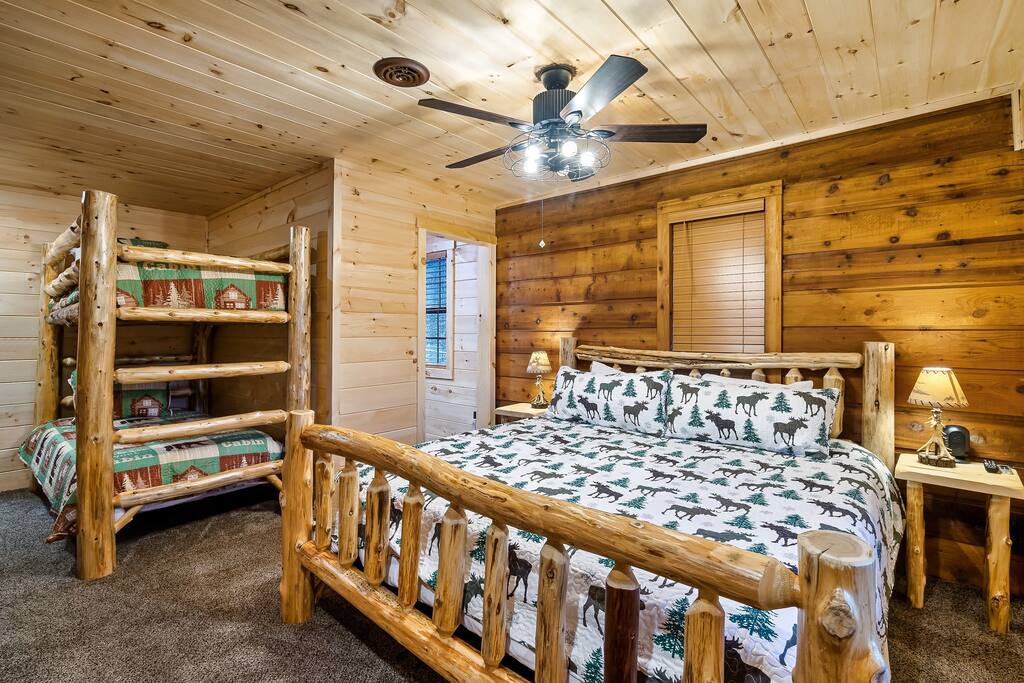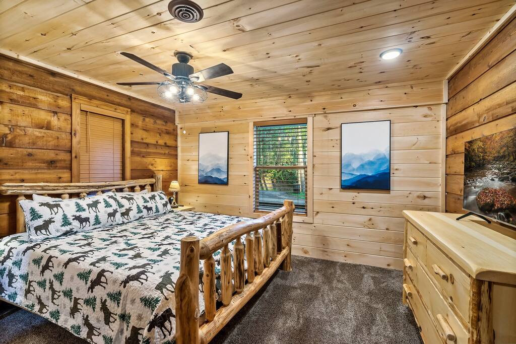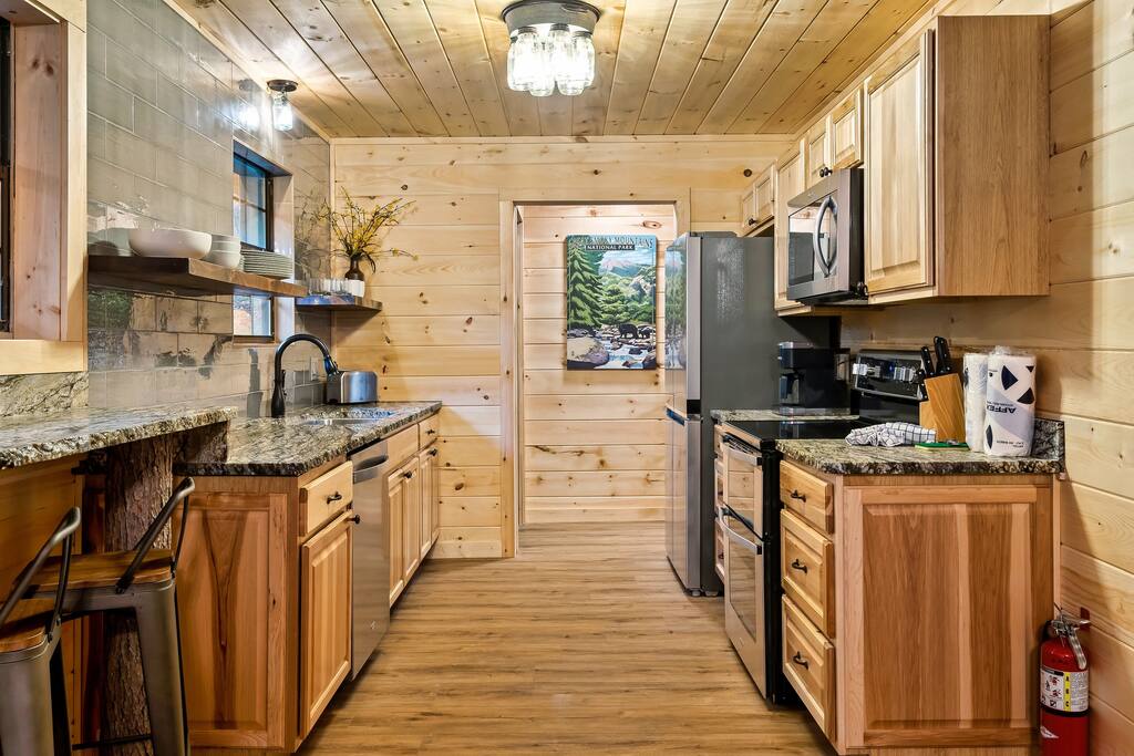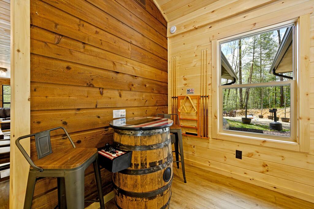 MINI-GOLF AND EXCELLENT RECREATION AREAS One of the best things about the cabin is its amenities and location! You never need to leave the cabin to enjoy your vacation! You are surrounded by custom, luxury design touches from the whiskey barrel bathroom vanities to the hand made log wood bar. There is a unique recreation room, 5-hole mini-golf course with two large outdoor play areas, a stunning private backyard with views of the smoky mountains through the trees. The backyard is perfect for your mountain getaway with firepit, large hot tub, string lights, outdoor games and more! Indoor there is a classic pool table, large HD TVs, multi-cade whiskey barrel arcade game, and board games all included in your stay! This cabin is also located in the highly desirable Gatlinburg Arts & Crafts district and a very short, easy 3.4 mile drive from the main Gatlinburg parkway. Mini-Golf Course, play house and Playset: • Adjacent to the cabin is a 5-hole, professional grade, mini-golf course! • A 30-foot, wooden train play set, hopscotch, and tire crawl is next to this mini-golf course and the cabin, perfect for a family play area. • Right up the hill from the golf course is a whimsical little play house for kids • The golf course, playset and play house are the only shared amenity. The golf course/playset/play house are shared only with you and two other cabins we manage next door! ALL OTHER CABIN AMENITIES BELOW ARE PRIVATE AND FOR YOUR EXCLUSIVE USE WHILE YOU STAY. Serene, Private Mountain Backyard: • Private, surrounded by beautiful forest and lined with string lights make the space feel magical • View through the trees of the surrounding mountains from the firepit • Large stone firepit with comfy Adirondack chairs & benches [firewood not provided] • Charcoal BBQ [briquettes not provided] • Outdoor dining table for 6 people and rocking chairs • Large, 7 person hot tub in separate outdoor area • Outdoor games include corn hole Recreation room: • Faux box wood wall with custom Smoky Mountain neon sign • Full size pool table • 70” HD TV • Custom whiskey barrel arcade video game (no charge) with 60+ classic arcade games • Assorted board games LIVING ROOM –The living room is surrounded by hand crafted tongue and groove, knotty pine walls and ceiling. The space is connected to the kitchen and dining room that has a gas fireplace, making it warm and cozy. The dining area has a custom rustic wood table with seating for eight and four bar stools at the custom kitchen bar. We have two full size plush leather couches, one that pulls out into a queen bed, which really sets the space apart as a place to watch TV, relax and enjoy the mountains! This space is ready for you to relax and enjoy the mountains or binge watch from the 65" HD Flat Screen TV. BEDROOMS The cabin sleeps up to 12 guests with 5 bedrooms and a queen mattress pull out sofa in the living room. Each bedroom is appointed with beautiful Smoky Mountain themed quilts, local hand crafted log frame beds and cozy comforters. Two of the bedrooms are suites with full bathrooms attached to the bedroom. King Suite 1: • King Bedroom Suite & HD TV • Full bathroom with shower and bathtub combo. • The truly one of a kind bathroom, has vanities hand crafted from real Tennessee Whiskey barrels and a walk in shower with a luxury rain spout like your very own spa. King Suite 2: • King Bedroom Suite & HD TV • Twin bunk beds in this suite make it perfect for families • Bathroom with tub/shower combination Bedroom 3: • Twin bunk bed Bedroom 4: • King Bed with custom log wood frame & HD TV Bedroom 5: • King Bed with custom log wood frame DINING ROOM – Custom reclaimed wood dining table with seating for 8 right next to the kitchen bar with seating for 4 more. There is also an outdoor dining table perfect for 6 to enjoy dinner KITCHEN – Well-appointed with all the major utensils, silverware, dishes, glasses and cookware needed for you to create & serve gourmet meals. Electric stove, oven, microwave, refrigerator, dishwasher, Keurig coffee maker, drip coffee maker, toaster, blender, etc.