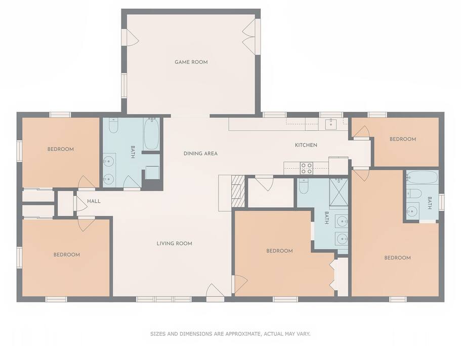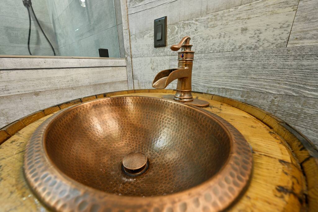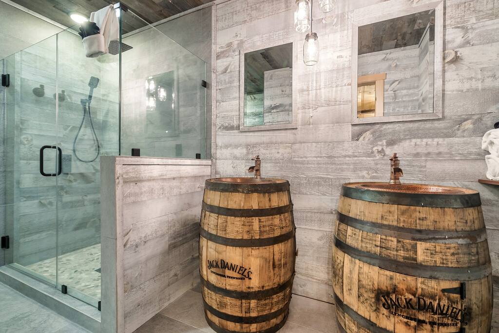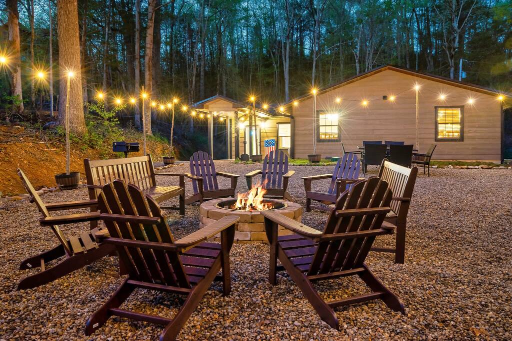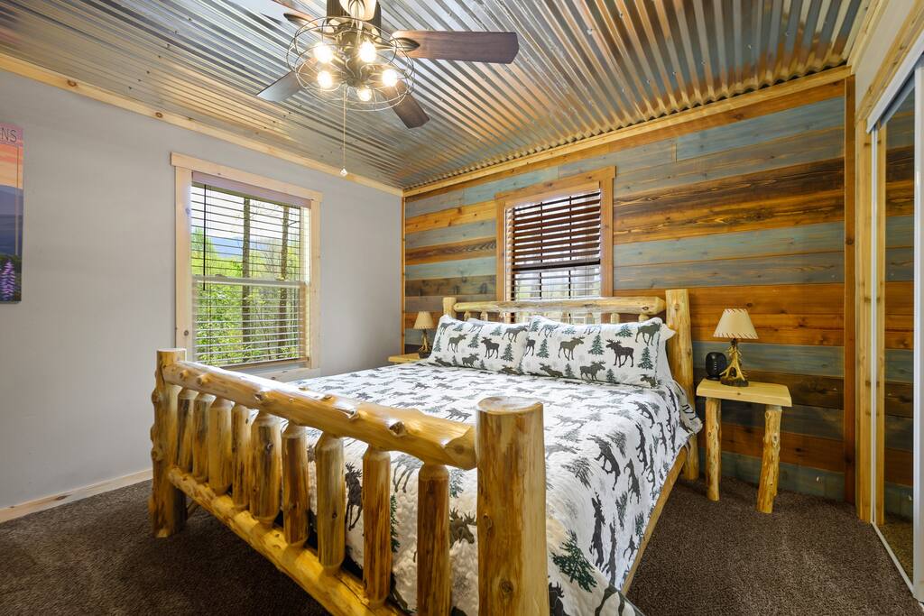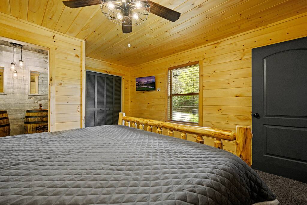 MINI-GOLF AND EXCELLENT RECREATION AREAS One of the best things about the cabin is its amenities and location! You never need to leave the cabin to enjoy your vacation! You are surrounded by custom, luxury design touches from the whiskey barrel bathroom vanities to the hand made log wood bar. There is a unique recreation room, 5-hole mini-golf course with two large outdoor play areas, a stunning private backyard with views of the smoky mountains through the trees. The backyard is perfect for your mountain getaway with firepit, large hot tub, string lights, outdoor games and more! Indoor there is a classic pool table, large HD TVs, multi-cade whiskey barrel arcade game, and board games all included in your stay! This cabin is also located in the highly desirable Gatlinburg Arts & Crafts district and a very short, easy 3.4 mile drive from the main Gatlinburg parkway. Mini-Golf Course, play house and Playset: • Adjacent to the cabin is a 5-hole, professional grade, mini-golf course! • A 30-foot, wooden train play set, hopscotch, and tire crawl is next to this mini-golf course and the cabin, perfect for a family play area. • Right up the hill from the golf course is a whimsical little play house for kids • The golf course, playset and play house are the only shared amenity. The golf course/playset/play house are shared only with you and two other cabins we manage next door! ALL OTHER CABIN AMENITIES BELOW ARE PRIVATE AND FOR YOUR EXCLUSIVE USE WHILE YOU STAY. Serene, Private Mountain Backyard: • Private, surrounded by beautiful forest and lined with string lights make the space feel magical • View through the trees of the surrounding mountains from the firepit • Large stone firepit with comfy Adirondack chairs & benches [firewood not provided] • Charcoal BBQ [briquettes not provided] • Outdoor dining table for 6 people and rocking chairs • Large, 7 person hot tub in separate outdoor area • Outdoor games include corn hole Recreation room: • Faux box wood wall with custom Smoky Mountain neon sign • Full size pool table • 70” HD TV • Custom whiskey barrel arcade video game (no charge) with 60+ classic arcade games • Assorted board games LIVING ROOM –The living room is surrounded by hand crafted tongue and groove, knotty pine walls and ceiling. The space is connected to the kitchen and dining room that has a gas fireplace, making it warm and cozy. The dining area has a custom rustic wood table with seating for eight and four bar stools at the custom kitchen bar. We have two full size plush leather couches, one that pulls out into a queen bed, which really sets the space apart as a place to watch TV, relax and enjoy the mountains! This space is ready for you to relax and enjoy the mountains or binge watch from the 65" HD Flat Screen TV. BEDROOMS The cabin sleeps up to 12 guests with 5 bedrooms and a queen mattress pull out sofa in the living room. Each bedroom is appointed with beautiful Smoky Mountain themed quilts, local hand crafted log frame beds and cozy comforters. Two of the bedrooms are suites with full bathrooms attached to the bedroom. King Suite 1: • King Bedroom Suite & HD TV • Full bathroom with shower and bathtub combo. • The truly one of a kind bathroom, has vanities hand crafted from real Tennessee Whiskey barrels and a walk in shower with a luxury rain spout like your very own spa. King Suite 2: • King Bedroom Suite & HD TV • Twin bunk beds in this suite make it perfect for families • Bathroom with tub/shower combination Bedroom 3: • Twin bunk bed Bedroom 4: • King Bed with custom log wood frame & HD TV Bedroom 5: • King Bed with custom log wood frame DINING ROOM – Custom reclaimed wood dining table with seating for 8 right next to the kitchen bar with seating for 4 more. There is also an outdoor dining table perfect for 6 to enjoy dinner KITCHEN – Well-appointed with all the major utensils, silverware, dishes, glasses and cookware needed for you to create & serve gourmet meals. Electric stove, oven, microwave, refrigerator, dishwasher, Keurig coffee maker, drip coffee maker, toaster, blender, etc.