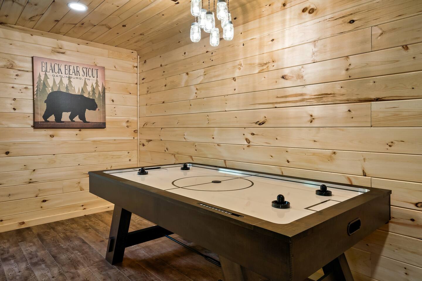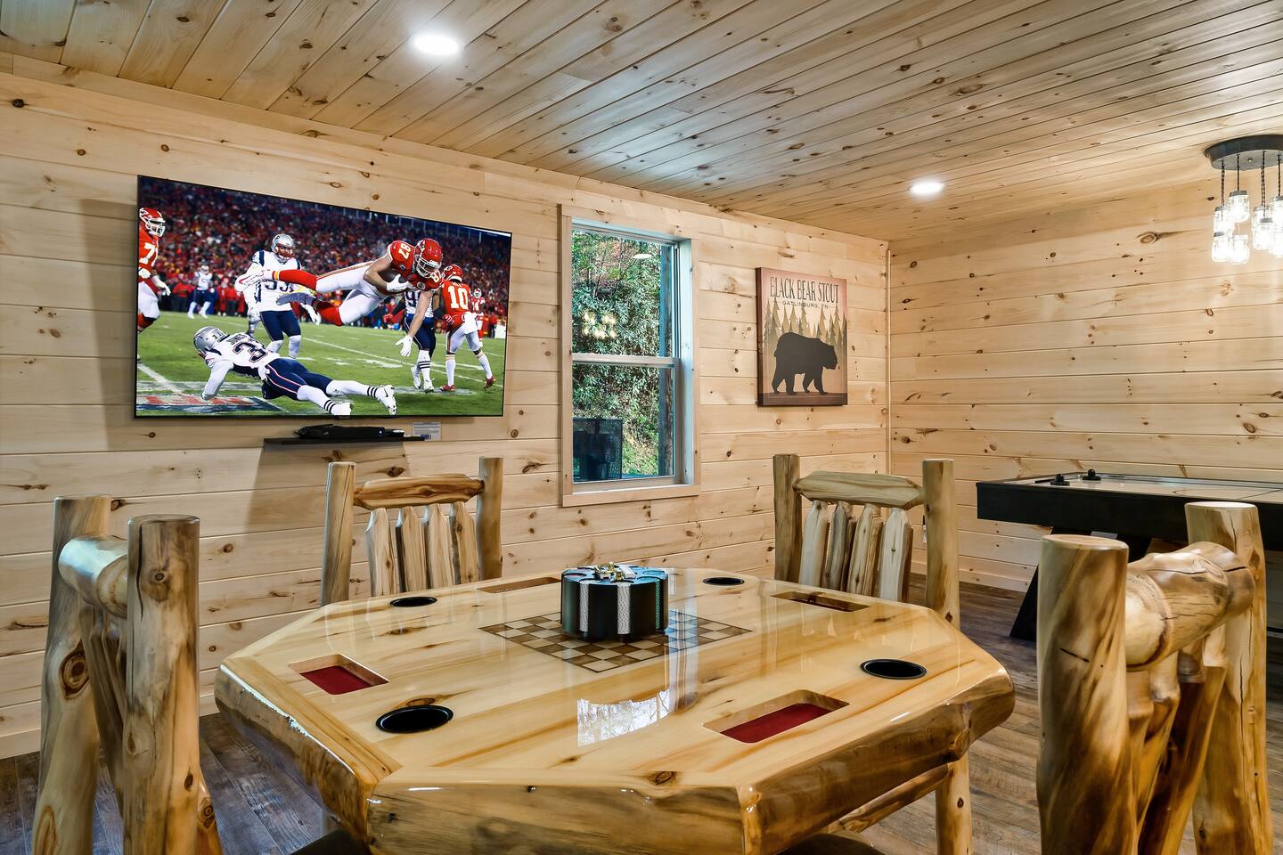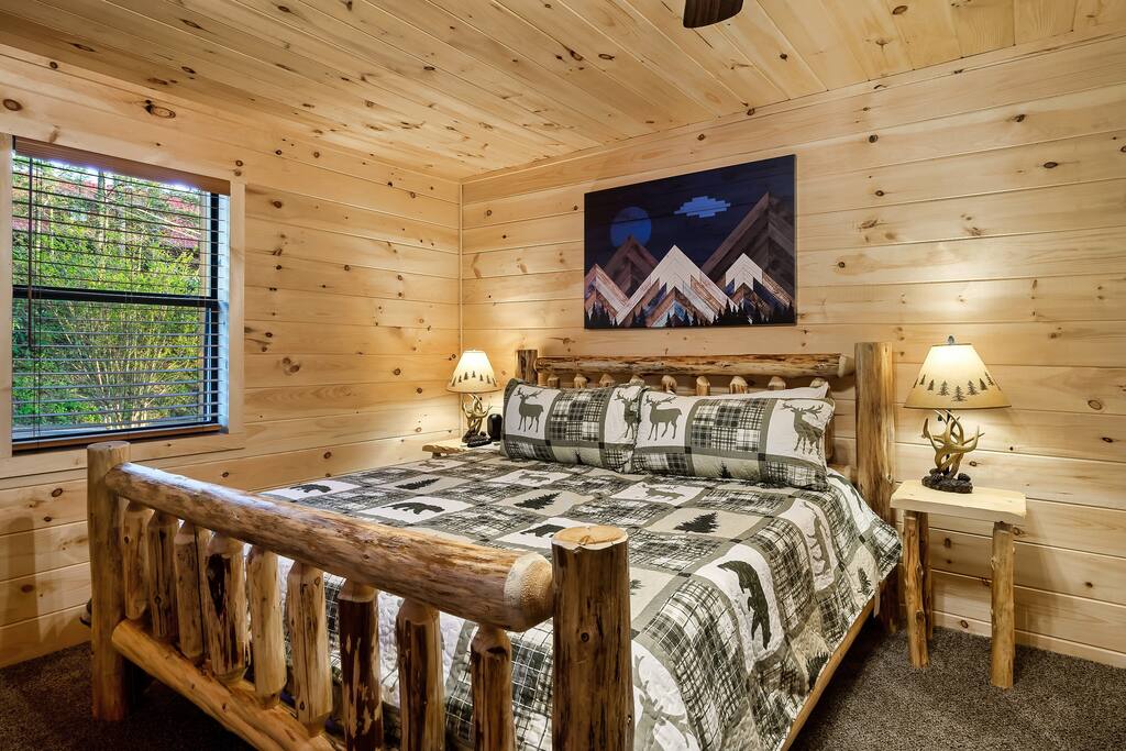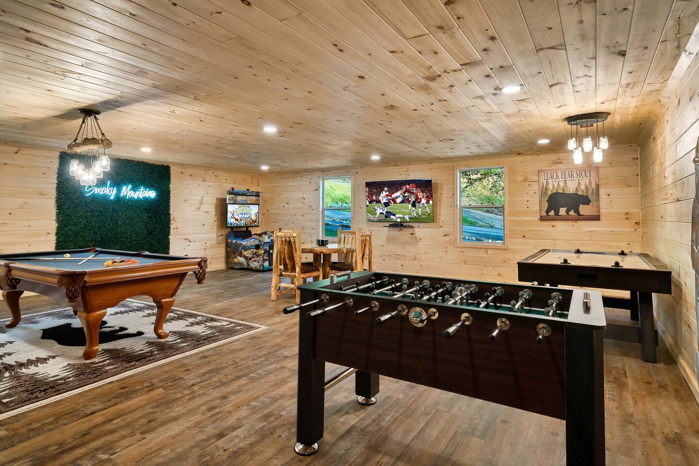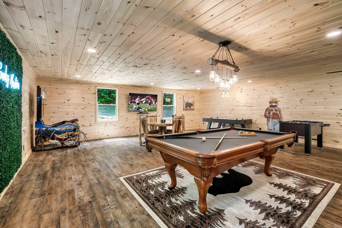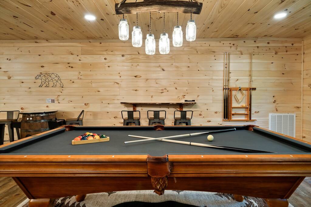 MINI-GOLF AND EXCELLENT RECREATION AREAS One of the best things about the cabin is its amenities and location! You never need to leave the cabin to enjoy your vacation with a huge, unique recreation room, semi-private, 5-hole mini-golf course, two large shared outdoor play areas, two private decks, a stunning backyard for your mountain getaway with firepit, large hot tub, string lights, outdoor games and more! Indoor there is a big buck hunter arcade game, classic pool table, foosball table, air hockey table, custom log wood poker/game table, large HD TVs, multi-cade arcade game, and board games all included in your stay! This cabin is located in the Gatlinburg Arts & Crafts district and a very short 3.4 mile drive from the main Gatlinburg parkway. Mini-Golf Course, play house and Playset: • Adjacent to the cabin is a 5-hole, professional grade, mini-golf course! • A 30-foot, wooden train play set, hopscotch, and tire crawl is next to this mini-golf course and the cabin, perfect for a family play area. • Right up the hill from the golf course is a whimsical little play house for kids • The golf course, playset and play house are the only shared amenity. The golf course/playset/play house are shared only with you and two other cabins we manage next door! ALL OTHER CABIN AMENITIES BELOW ARE PRIVATE AND FOR YOUR EXCLUSIVE USE WHILE YOU STAY. Serene, Private, Mountain Backyard: • Private, surrounded by beautiful forest and lined with picturesque lights make the space feel magical • Large stone firepit with comfy Adirondack chairs & benches [firewood not provided] • Gas BBQ with propane provided • Outdoor dining table for 6 people and rocking chairs • Large hot tub • Screened porch connected to the house allowing you to enjoy the two rockers • Outdoor games include oversized connect four & corn hole Outstanding recreation room: • Big Buck Hunter Video Game (free for use during your stay) • Air hockey table • Large pool table • Foosball table • Custom log wood poker/game table with 4 log chairs, checkers and poker set • 75” HD TV and full cable service • Custom whiskey barrel arcade video game (no charge) with 60+ classic arcade games • Assorted board games LIVING ROOMS –There are two living rooms which are surrounded by hand crafted tongue and groove, knotty pine walls and ceiling. Both spaces are connected to the kitchen and dining room they have two gas fireplaces making them cozy. The dining area is anchored with custom log wood table with seating for eight and four bar stools at the kitchen bar. We have three plush leather couches and two rockers which really set both spaces apart as a place to watch TV, relax and enjoy the mountains! This space is warm, cozy and ready for you to relax and enjoy the mountains or binge watch from the 60" HD Flat Screen TV. BEDROOMS The cabin sleeps up to 12 guests with 4 bedrooms and a queen mattress pull out sofa in the living room. Each bedroom is appointed with beautiful Smoky Mountain themed quilts, hand crafted log frame beds and cozy comforters. Two of the bedrooms are suites with full bathrooms attached to the bedroom. King Suite 1: • King Bedroom Suite & HD TV • Full bathroom with shower and bathtub combo King Suite 2: • King Bedroom Suite & HDTV • Bathroom with walk in shower • Large walk-in closet Bedroom 3 Bunk Room (Sleeps 4 – 2 bunks, 4 beds): • Twin bed, log wood bunk bed • Twin bed, log wood bunk bed Bedroom 4 (Sleeps 4): • King bed & HD TV • Twin bunk bed DINING ROOM – Custom log-wood dining table with seating for 8 right next to the kitchen bar with seating for 4 more. The deck connected to the kitchen & living room also has an outdoor dining table perfect for 6 to enjoy dinner and two large rocking chairs KITCHEN – Well-appointed with all the major utensils, silverware, dishes, glasses and cookware needed for you to create & serve gourmet meals. Electric stove, oven, microwave, refrigerator, dishwasher, Keurig coffee maker, drip coffee maker, toaster, blender, etc. ADDITIONAL AMENITIES – • Full size washer and dryer • Convenient location right in the Gatlinburg Arts & Crafts Community and only 3.4 miles away from the downtown Parkway! Easy access to great restaurants, shopping, Ripley's Aquarium, & the entrance to The Great Smoky Mountains National Park all only 4 miles away. • Convenient access to Pigeon Forge, only 7.8 miles away! • Only 11 miles away from the entrance to Dollywood/Splash Country! • Just minutes from this cabin is the beautiful Gatlinburg Community Center - a complex with indoor swimming pool, basketball court, ping pong, bowling alley, weight room and showers. For a very reasonable fee visitors are welcome to take advantage of this beautiful complex. • Convenient paved parking with plenty of space for 5 standard size SUVs. No RV or trailer parking permitted. • Heating & A/C