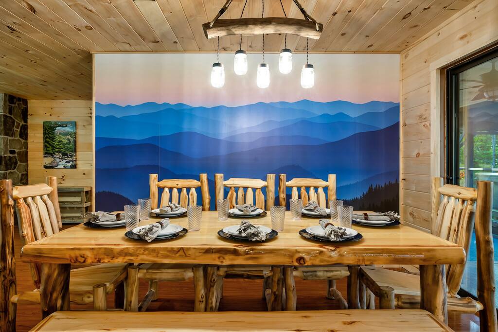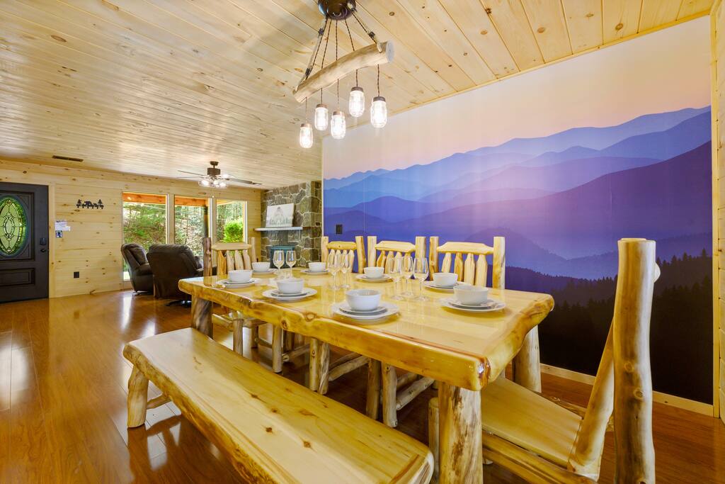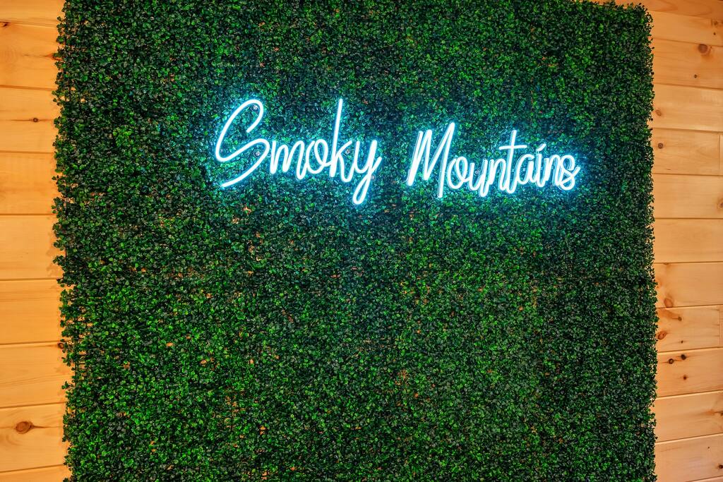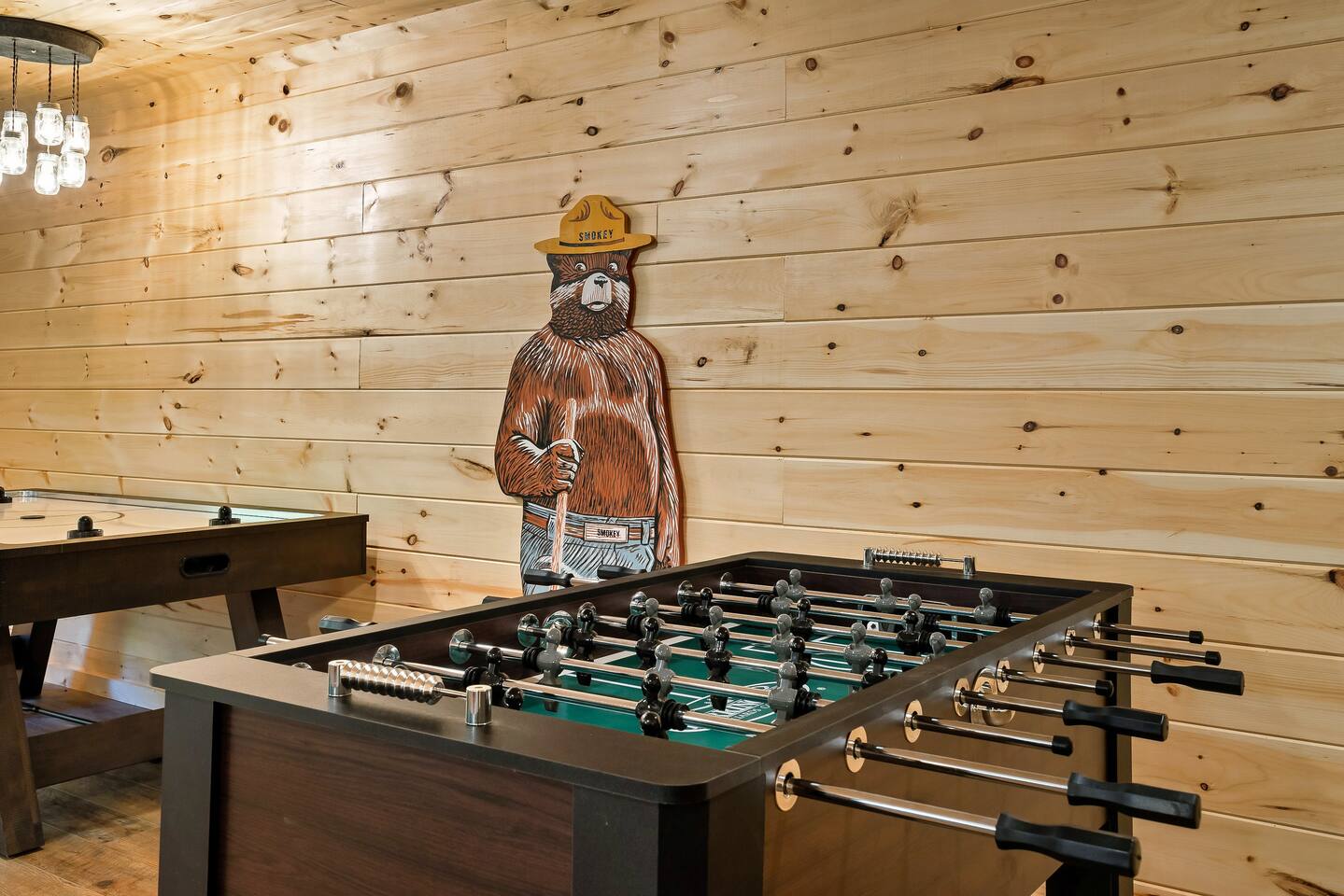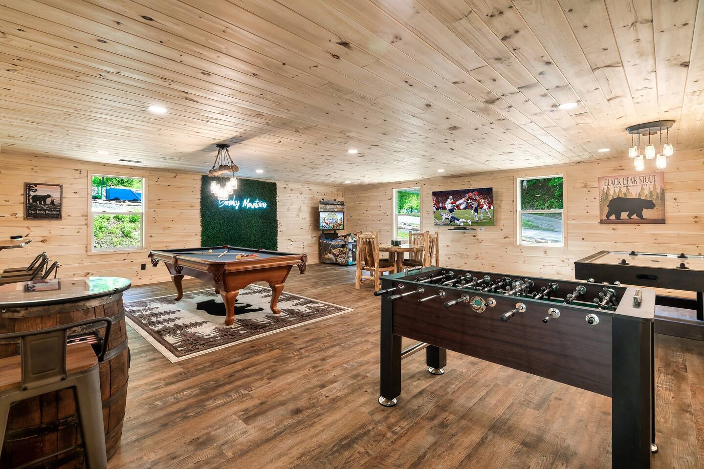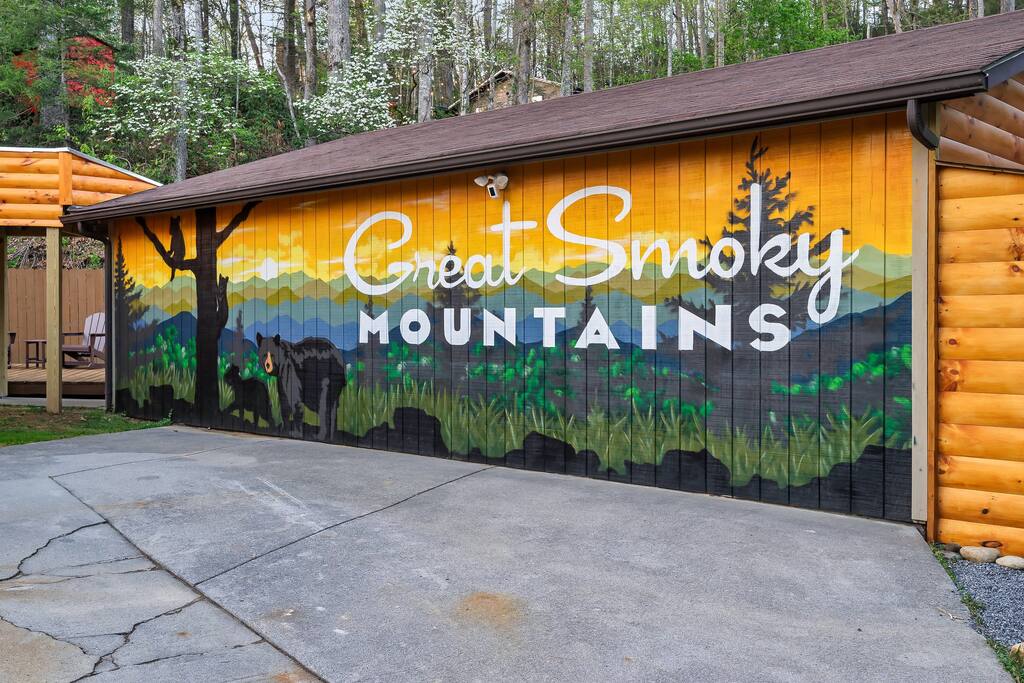 MINI-GOLF AND EXCELLENT RECREATION AREAS One of the best things about the cabin is its amenities and location! You never need to leave the cabin to enjoy your vacation with a huge, unique recreation room, semi-private, 5-hole mini-golf course, two large shared outdoor play areas, two private decks, a stunning backyard for your mountain getaway with firepit, large hot tub, string lights, outdoor games and more! Indoor there is a big buck hunter arcade game, classic pool table, foosball table, air hockey table, custom log wood poker/game table, large HD TVs, multi-cade arcade game, and board games all included in your stay! This cabin is located in the Gatlinburg Arts & Crafts district and a very short 3.4 mile drive from the main Gatlinburg parkway. Mini-Golf Course, play house and Playset: • Adjacent to the cabin is a 5-hole, professional grade, mini-golf course! • A 30-foot, wooden train play set, hopscotch, and tire crawl is next to this mini-golf course and the cabin, perfect for a family play area. • Right up the hill from the golf course is a whimsical little play house for kids • The golf course, playset and play house are the only shared amenity. The golf course/playset/play house are shared only with you and two other cabins we manage next door! ALL OTHER CABIN AMENITIES BELOW ARE PRIVATE AND FOR YOUR EXCLUSIVE USE WHILE YOU STAY. Serene, Private, Mountain Backyard: • Private, surrounded by beautiful forest and lined with picturesque lights make the space feel magical • Large stone firepit with comfy Adirondack chairs & benches [firewood not provided] • Gas BBQ with propane provided • Outdoor dining table for 6 people and rocking chairs • Large hot tub • Screened porch connected to the house allowing you to enjoy the two rockers • Outdoor games include oversized connect four & corn hole Outstanding recreation room: • Big Buck Hunter Video Game (free for use during your stay) • Air hockey table • Large pool table • Foosball table • Custom log wood poker/game table with 4 log chairs, checkers and poker set • 75” HD TV and full cable service • Custom whiskey barrel arcade video game (no charge) with 60+ classic arcade games • Assorted board games LIVING ROOMS –There are two living rooms which are surrounded by hand crafted tongue and groove, knotty pine walls and ceiling. Both spaces are connected to the kitchen and dining room they have two gas fireplaces making them cozy. The dining area is anchored with custom log wood table with seating for eight and four bar stools at the kitchen bar. We have three plush leather couches and two rockers which really set both spaces apart as a place to watch TV, relax and enjoy the mountains! This space is warm, cozy and ready for you to relax and enjoy the mountains or binge watch from the 60" HD Flat Screen TV. BEDROOMS The cabin sleeps up to 12 guests with 4 bedrooms and a queen mattress pull out sofa in the living room. Each bedroom is appointed with beautiful Smoky Mountain themed quilts, hand crafted log frame beds and cozy comforters. Two of the bedrooms are suites with full bathrooms attached to the bedroom. King Suite 1: • King Bedroom Suite & HD TV • Full bathroom with shower and bathtub combo King Suite 2: • King Bedroom Suite & HDTV • Bathroom with walk in shower • Large walk-in closet Bedroom 3 Bunk Room (Sleeps 4 – 2 bunks, 4 beds): • Twin bed, log wood bunk bed • Twin bed, log wood bunk bed Bedroom 4 (Sleeps 4): • King bed & HD TV • Twin bunk bed DINING ROOM – Custom log-wood dining table with seating for 8 right next to the kitchen bar with seating for 4 more. The deck connected to the kitchen & living room also has an outdoor dining table perfect for 6 to enjoy dinner and two large rocking chairs KITCHEN – Well-appointed with all the major utensils, silverware, dishes, glasses and cookware needed for you to create & serve gourmet meals. Electric stove, oven, microwave, refrigerator, dishwasher, Keurig coffee maker, drip coffee maker, toaster, blender, etc. ADDITIONAL AMENITIES – • Full size washer and dryer • Convenient location right in the Gatlinburg Arts & Crafts Community and only 3.4 miles away from the downtown Parkway! Easy access to great restaurants, shopping, Ripley's Aquarium, & the entrance to The Great Smoky Mountains National Park all only 4 miles away. • Convenient access to Pigeon Forge, only 7.8 miles away! • Only 11 miles away from the entrance to Dollywood/Splash Country! • Just minutes from this cabin is the beautiful Gatlinburg Community Center - a complex with indoor swimming pool, basketball court, ping pong, bowling alley, weight room and showers. For a very reasonable fee visitors are welcome to take advantage of this beautiful complex. • Convenient paved parking with plenty of space for 5 standard size SUVs. No RV or trailer parking permitted. • Heating & A/C
