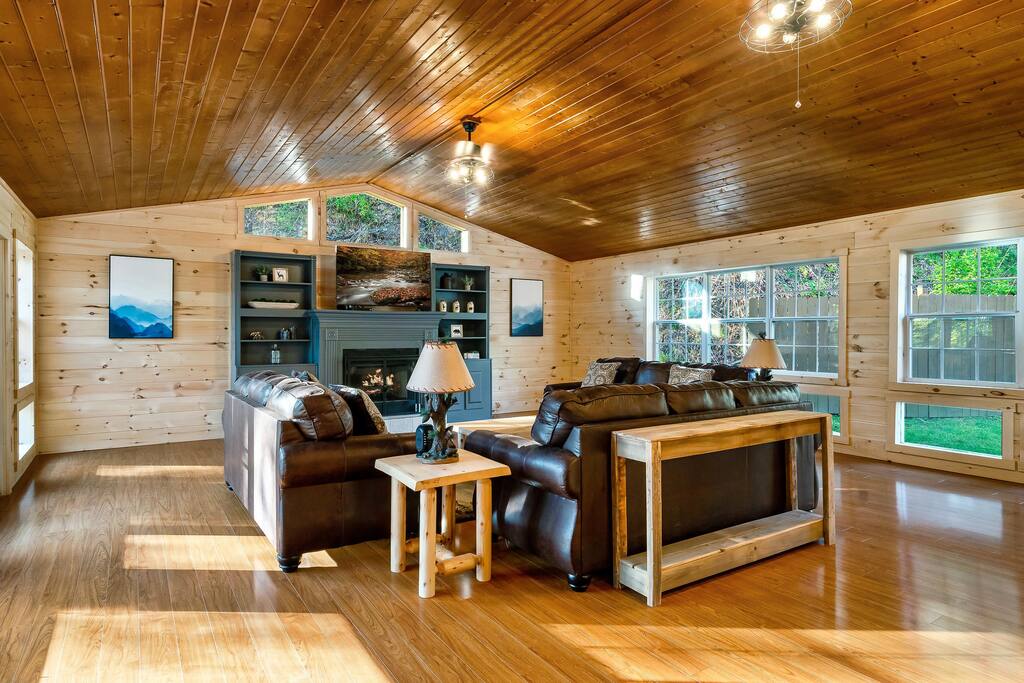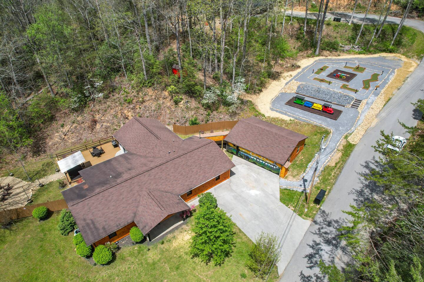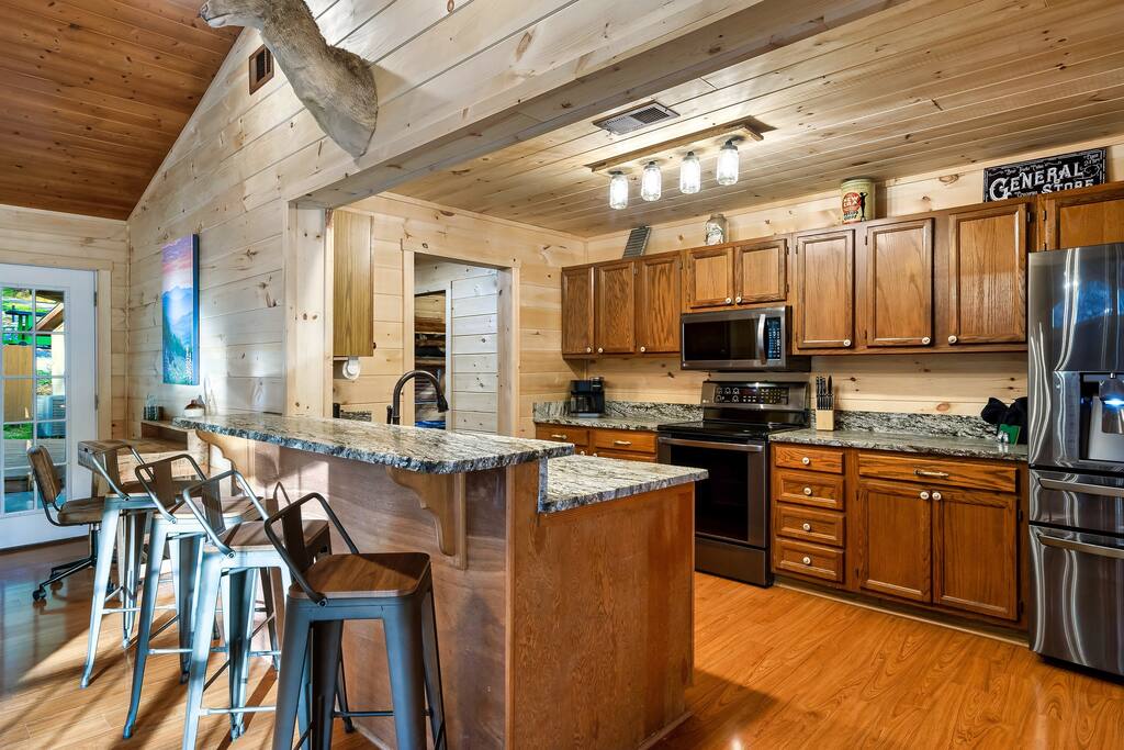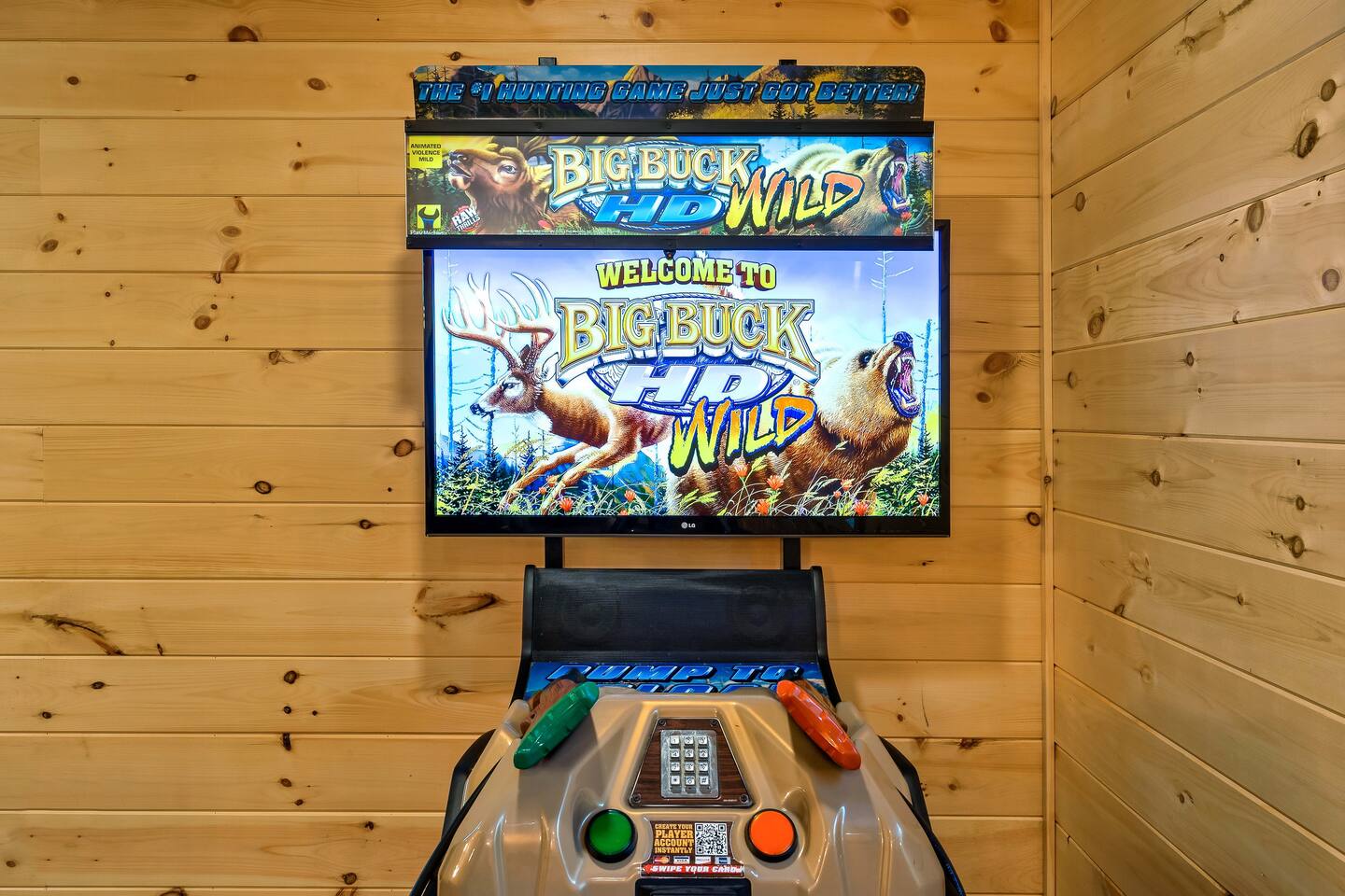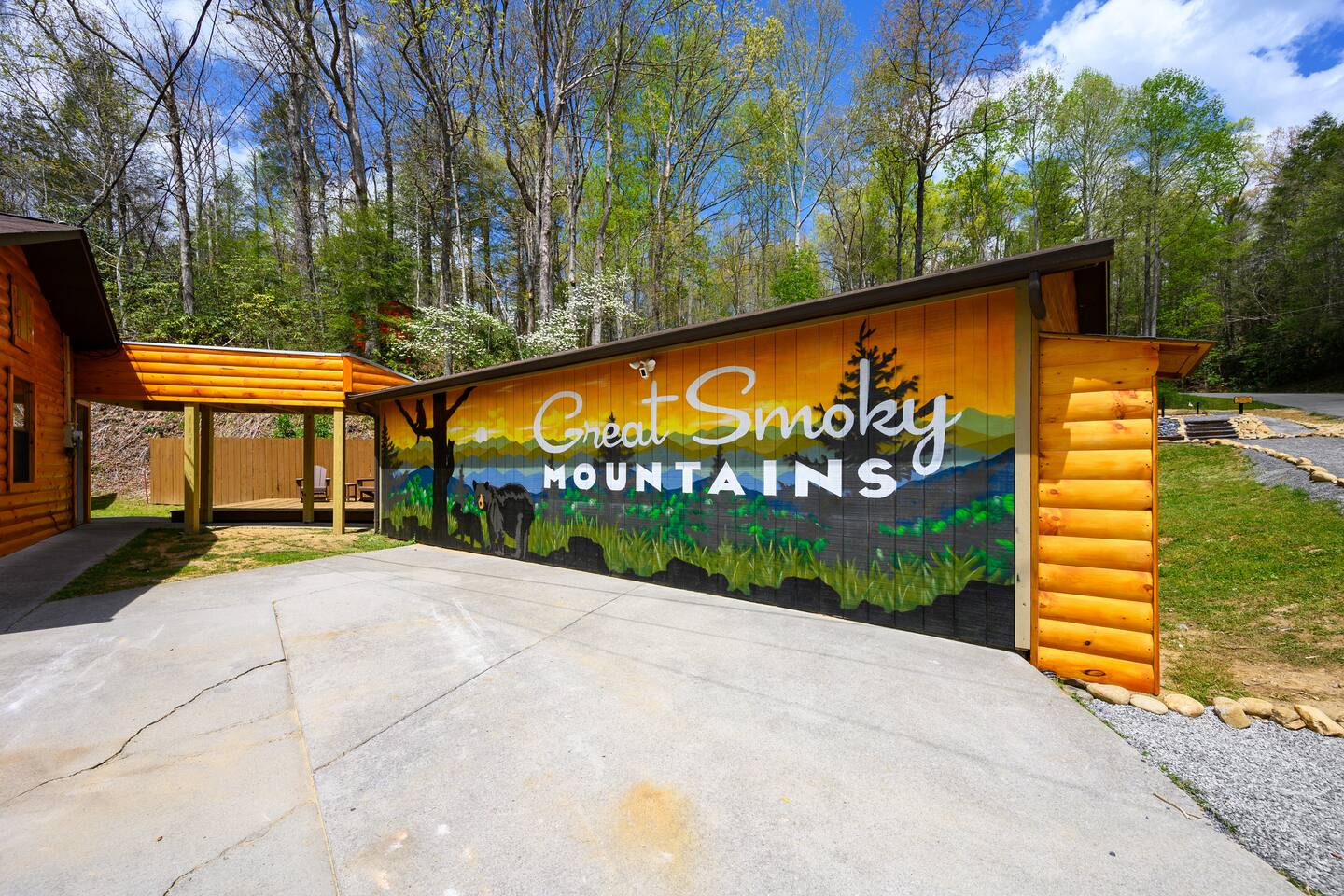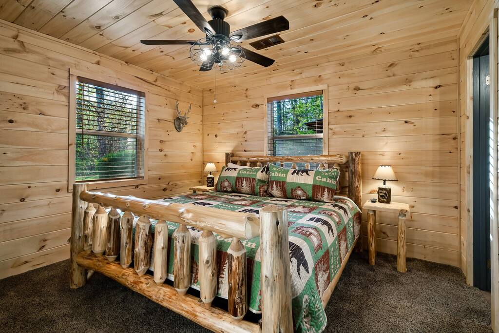 MINI-GOLF AND EXCELLENT RECREATION AREAS One of the best things about the cabin is its amenities and location! You never need to leave the cabin to enjoy your vacation with a huge, unique recreation room, semi-private, 5-hole mini-golf course, two large shared outdoor play areas, two private decks, a stunning backyard for your mountain getaway with firepit, large hot tub, string lights, outdoor games and more! Indoor there is a big buck hunter arcade game, classic pool table, foosball table, air hockey table, custom log wood poker/game table, large HD TVs, multi-cade arcade game, and board games all included in your stay! This cabin is located in the Gatlinburg Arts & Crafts district and a very short 3.4 mile drive from the main Gatlinburg parkway. Mini-Golf Course, play house and Playset: • Adjacent to the cabin is a 5-hole, professional grade, mini-golf course! • A 30-foot, wooden train play set, hopscotch, and tire crawl is next to this mini-golf course and the cabin, perfect for a family play area. • Right up the hill from the golf course is a whimsical little play house for kids • The golf course, playset and play house are the only shared amenity. The golf course/playset/play house are shared only with you and two other cabins we manage next door! ALL OTHER CABIN AMENITIES BELOW ARE PRIVATE AND FOR YOUR EXCLUSIVE USE WHILE YOU STAY. Serene, Private, Mountain Backyard: • Private, surrounded by beautiful forest and lined with picturesque lights make the space feel magical • Large stone firepit with comfy Adirondack chairs & benches [firewood not provided] • Gas BBQ with propane provided • Outdoor dining table for 6 people and rocking chairs • Large hot tub • Screened porch connected to the house allowing you to enjoy the two rockers • Outdoor games include oversized connect four & corn hole Outstanding recreation room: • Big Buck Hunter Video Game (free for use during your stay) • Air hockey table • Large pool table • Foosball table • Custom log wood poker/game table with 4 log chairs, checkers and poker set • 75” HD TV and full cable service • Custom whiskey barrel arcade video game (no charge) with 60+ classic arcade games • Assorted board games LIVING ROOMS –There are two living rooms which are surrounded by hand crafted tongue and groove, knotty pine walls and ceiling. Both spaces are connected to the kitchen and dining room they have two gas fireplaces making them cozy. The dining area is anchored with custom log wood table with seating for eight and four bar stools at the kitchen bar. We have three plush leather couches and two rockers which really set both spaces apart as a place to watch TV, relax and enjoy the mountains! This space is warm, cozy and ready for you to relax and enjoy the mountains or binge watch from the 60" HD Flat Screen TV. BEDROOMS The cabin sleeps up to 12 guests with 4 bedrooms and a queen mattress pull out sofa in the living room. Each bedroom is appointed with beautiful Smoky Mountain themed quilts, hand crafted log frame beds and cozy comforters. Two of the bedrooms are suites with full bathrooms attached to the bedroom. King Suite 1: • King Bedroom Suite & HD TV • Full bathroom with shower and bathtub combo King Suite 2: • King Bedroom Suite & HDTV • Bathroom with walk in shower • Large walk-in closet Bedroom 3 Bunk Room (Sleeps 4 – 2 bunks, 4 beds): • Twin bed, log wood bunk bed • Twin bed, log wood bunk bed Bedroom 4 (Sleeps 4): • King bed & HD TV • Twin bunk bed DINING ROOM – Custom log-wood dining table with seating for 8 right next to the kitchen bar with seating for 4 more. The deck connected to the kitchen & living room also has an outdoor dining table perfect for 6 to enjoy dinner and two large rocking chairs KITCHEN – Well-appointed with all the major utensils, silverware, dishes, glasses and cookware needed for you to create & serve gourmet meals. Electric stove, oven, microwave, refrigerator, dishwasher, Keurig coffee maker, drip coffee maker, toaster, blender, etc. ADDITIONAL AMENITIES – • Full size washer and dryer • Convenient location right in the Gatlinburg Arts & Crafts Community and only 3.4 miles away from the downtown Parkway! Easy access to great restaurants, shopping, Ripley's Aquarium, & the entrance to The Great Smoky Mountains National Park all only 4 miles away. • Convenient access to Pigeon Forge, only 7.8 miles away! • Only 11 miles away from the entrance to Dollywood/Splash Country! • Just minutes from this cabin is the beautiful Gatlinburg Community Center - a complex with indoor swimming pool, basketball court, ping pong, bowling alley, weight room and showers. For a very reasonable fee visitors are welcome to take advantage of this beautiful complex. • Convenient paved parking with plenty of space for 5 standard size SUVs. No RV or trailer parking permitted. • Heating & A/C