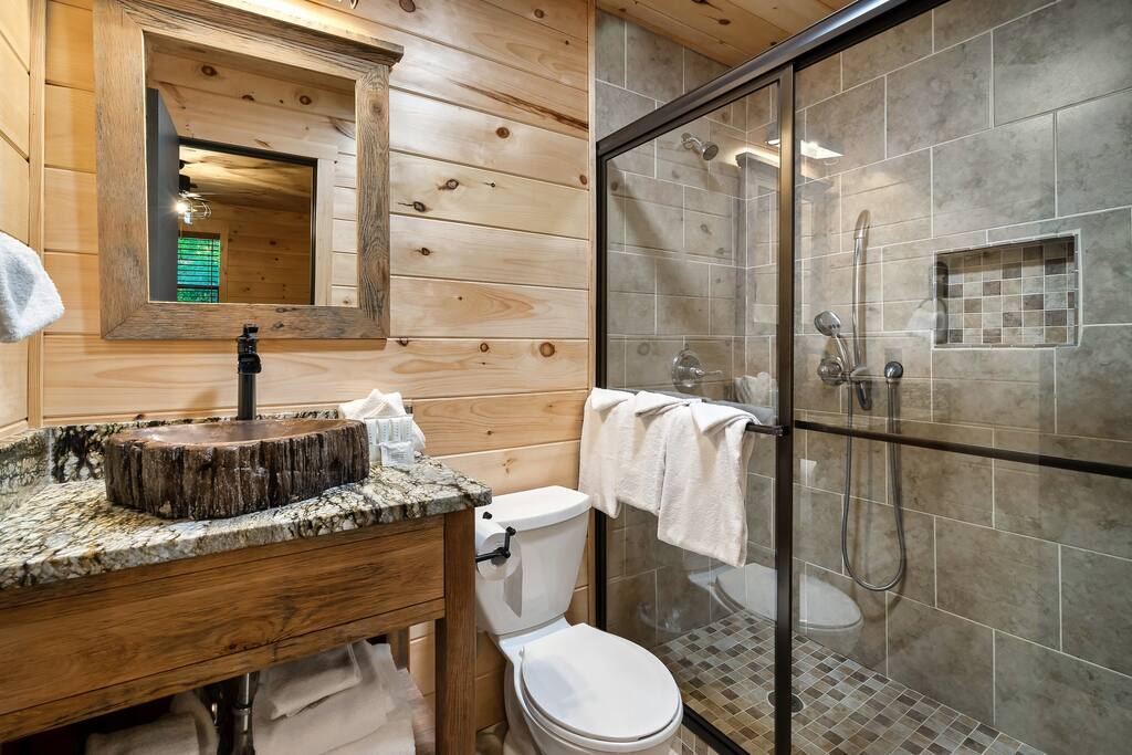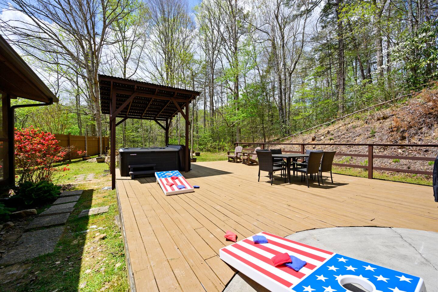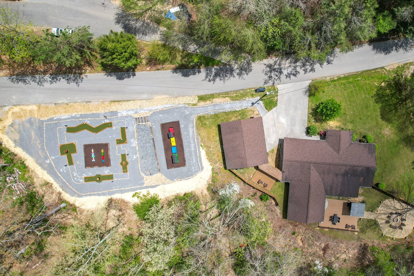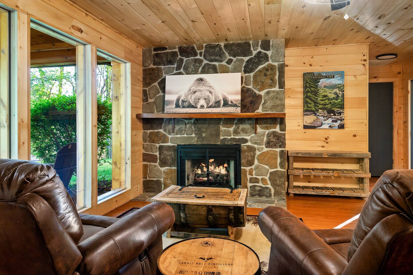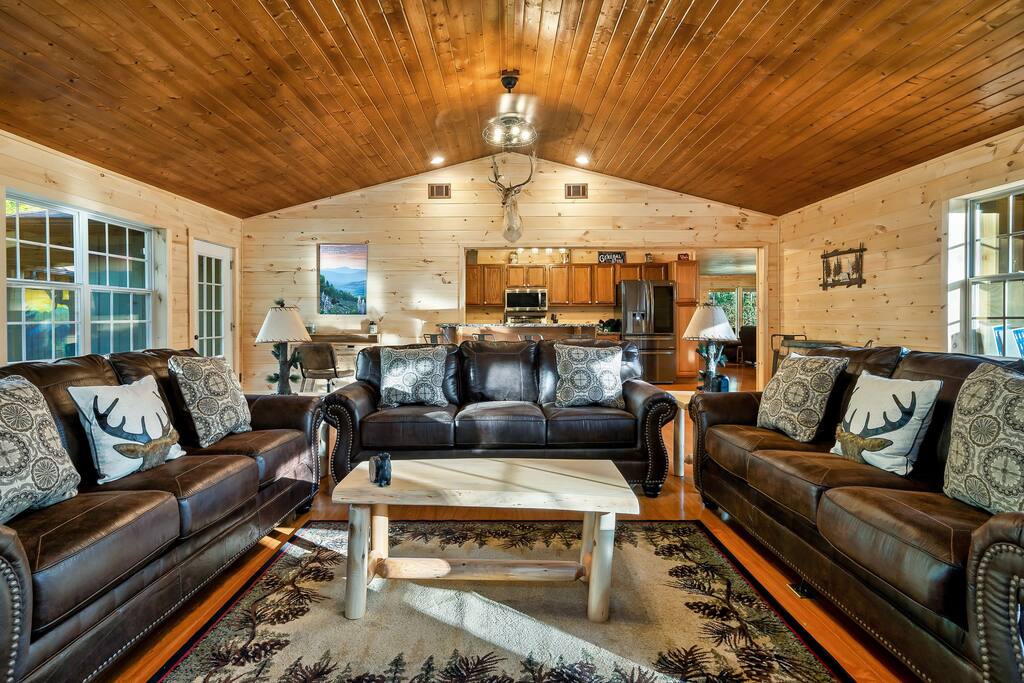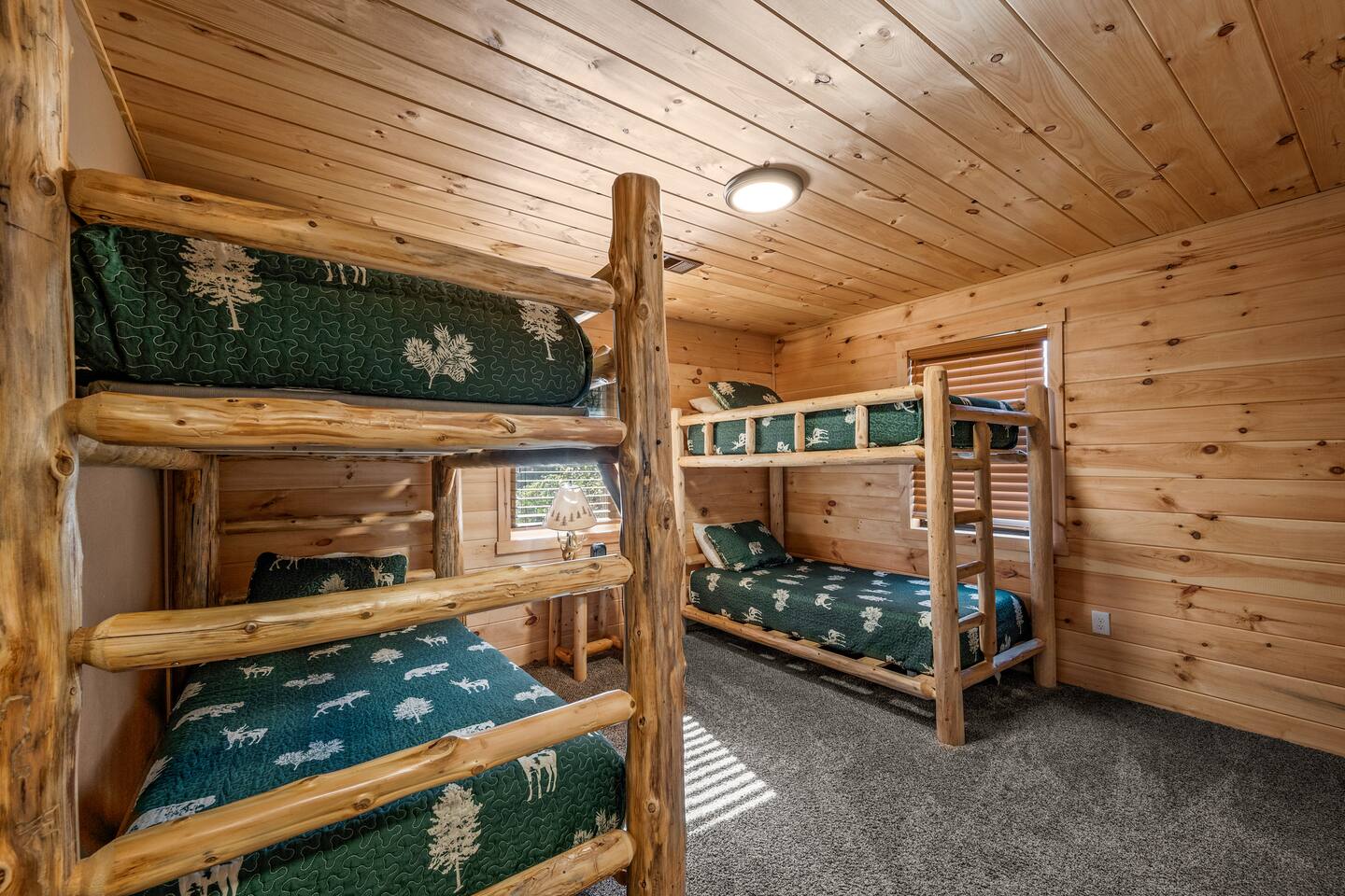 MINI-GOLF AND EXCELLENT RECREATION AREAS One of the best things about the cabin is its amenities and location! You never need to leave the cabin to enjoy your vacation with a huge, unique recreation room, semi-private, 5-hole mini-golf course, two large shared outdoor play areas, two private decks, a stunning backyard for your mountain getaway with firepit, large hot tub, string lights, outdoor games and more! Indoor there is a big buck hunter arcade game, classic pool table, foosball table, air hockey table, custom log wood poker/game table, large HD TVs, multi-cade arcade game, and board games all included in your stay! This cabin is located in the Gatlinburg Arts & Crafts district and a very short 3.4 mile drive from the main Gatlinburg parkway. Mini-Golf Course, play house and Playset: • Adjacent to the cabin is a 5-hole, professional grade, mini-golf course! • A 30-foot, wooden train play set, hopscotch, and tire crawl is next to this mini-golf course and the cabin, perfect for a family play area. • Right up the hill from the golf course is a whimsical little play house for kids • The golf course, playset and play house are the only shared amenity. The golf course/playset/play house are shared only with you and two other cabins we manage next door! ALL OTHER CABIN AMENITIES BELOW ARE PRIVATE AND FOR YOUR EXCLUSIVE USE WHILE YOU STAY. Serene, Private, Mountain Backyard: • Private, surrounded by beautiful forest and lined with picturesque lights make the space feel magical • Large stone firepit with comfy Adirondack chairs & benches [firewood not provided] • Gas BBQ with propane provided • Outdoor dining table for 6 people and rocking chairs • Large hot tub • Screened porch connected to the house allowing you to enjoy the two rockers • Outdoor games include oversized connect four & corn hole Outstanding recreation room: • Big Buck Hunter Video Game (free for use during your stay) • Air hockey table • Large pool table • Foosball table • Custom log wood poker/game table with 4 log chairs, checkers and poker set • 75” HD TV and full cable service • Custom whiskey barrel arcade video game (no charge) with 60+ classic arcade games • Assorted board games LIVING ROOMS –There are two living rooms which are surrounded by hand crafted tongue and groove, knotty pine walls and ceiling. Both spaces are connected to the kitchen and dining room they have two gas fireplaces making them cozy. The dining area is anchored with custom log wood table with seating for eight and four bar stools at the kitchen bar. We have three plush leather couches and two rockers which really set both spaces apart as a place to watch TV, relax and enjoy the mountains! This space is warm, cozy and ready for you to relax and enjoy the mountains or binge watch from the 60" HD Flat Screen TV. BEDROOMS The cabin sleeps up to 12 guests with 4 bedrooms and a queen mattress pull out sofa in the living room. Each bedroom is appointed with beautiful Smoky Mountain themed quilts, hand crafted log frame beds and cozy comforters. Two of the bedrooms are suites with full bathrooms attached to the bedroom. King Suite 1: • King Bedroom Suite & HD TV • Full bathroom with shower and bathtub combo King Suite 2: • King Bedroom Suite & HDTV • Bathroom with walk in shower • Large walk-in closet Bedroom 3 Bunk Room (Sleeps 4 – 2 bunks, 4 beds): • Twin bed, log wood bunk bed • Twin bed, log wood bunk bed Bedroom 4 (Sleeps 4): • King bed & HD TV • Twin bunk bed DINING ROOM – Custom log-wood dining table with seating for 8 right next to the kitchen bar with seating for 4 more. The deck connected to the kitchen & living room also has an outdoor dining table perfect for 6 to enjoy dinner and two large rocking chairs KITCHEN – Well-appointed with all the major utensils, silverware, dishes, glasses and cookware needed for you to create & serve gourmet meals. Electric stove, oven, microwave, refrigerator, dishwasher, Keurig coffee maker, drip coffee maker, toaster, blender, etc. ADDITIONAL AMENITIES – • Full size washer and dryer • Convenient location right in the Gatlinburg Arts & Crafts Community and only 3.4 miles away from the downtown Parkway! Easy access to great restaurants, shopping, Ripley's Aquarium, & the entrance to The Great Smoky Mountains National Park all only 4 miles away. • Convenient access to Pigeon Forge, only 7.8 miles away! • Only 11 miles away from the entrance to Dollywood/Splash Country! • Just minutes from this cabin is the beautiful Gatlinburg Community Center - a complex with indoor swimming pool, basketball court, ping pong, bowling alley, weight room and showers. For a very reasonable fee visitors are welcome to take advantage of this beautiful complex. • Convenient paved parking with plenty of space for 5 standard size SUVs. No RV or trailer parking permitted. • Heating & A/C