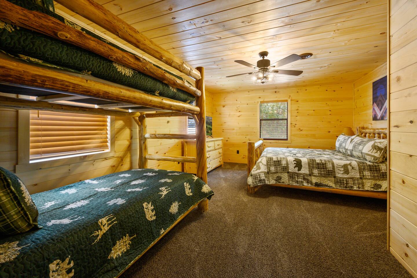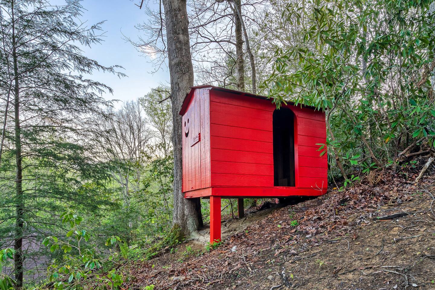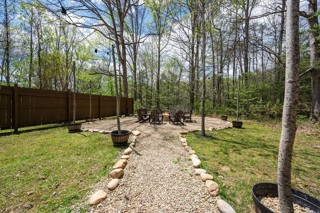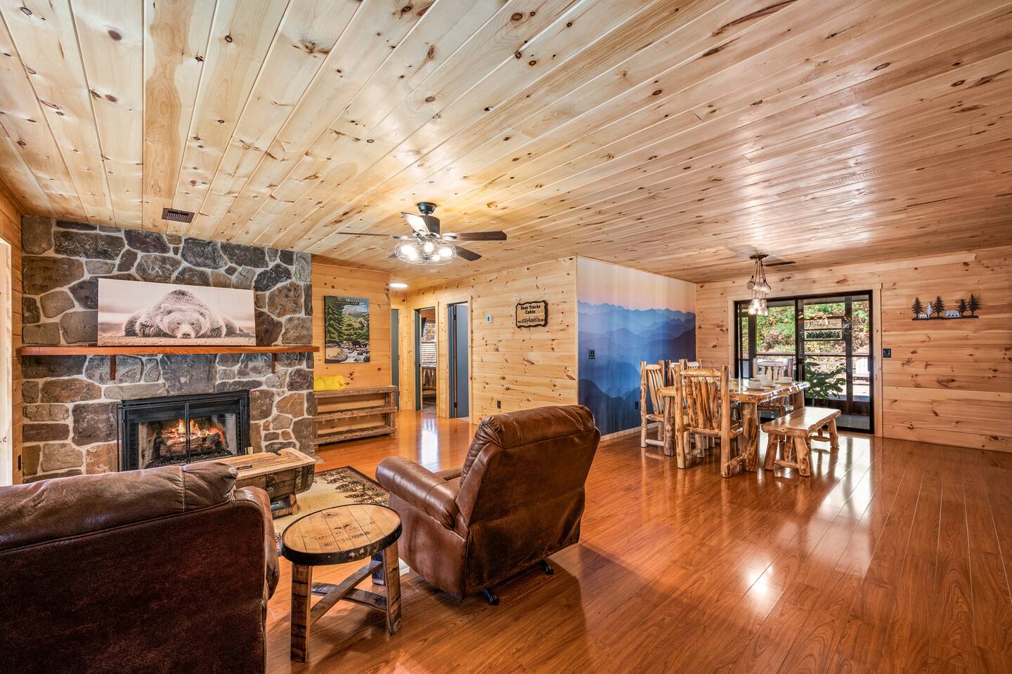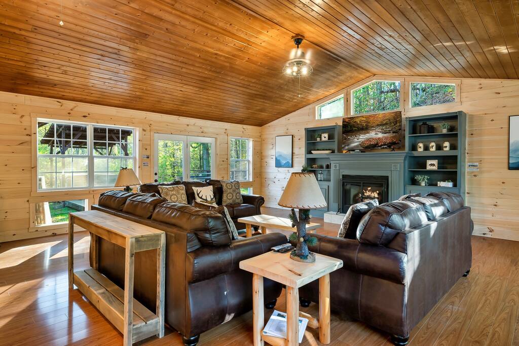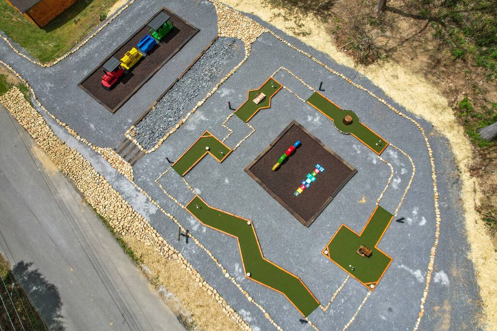 MINI-GOLF AND EXCELLENT RECREATION AREAS One of the best things about the cabin is its amenities and location! You never need to leave the cabin to enjoy your vacation with a huge, unique recreation room, semi-private, 5-hole mini-golf course, two large shared outdoor play areas, two private decks, a stunning backyard for your mountain getaway with firepit, large hot tub, string lights, outdoor games and more! Indoor there is a big buck hunter arcade game, classic pool table, foosball table, air hockey table, custom log wood poker/game table, large HD TVs, multi-cade arcade game, and board games all included in your stay! This cabin is located in the Gatlinburg Arts & Crafts district and a very short 3.4 mile drive from the main Gatlinburg parkway. Mini-Golf Course, play house and Playset: • Adjacent to the cabin is a 5-hole, professional grade, mini-golf course! • A 30-foot, wooden train play set, hopscotch, and tire crawl is next to this mini-golf course and the cabin, perfect for a family play area. • Right up the hill from the golf course is a whimsical little play house for kids • The golf course, playset and play house are the only shared amenity. The golf course/playset/play house are shared only with you and two other cabins we manage next door! ALL OTHER CABIN AMENITIES BELOW ARE PRIVATE AND FOR YOUR EXCLUSIVE USE WHILE YOU STAY. Serene, Private, Mountain Backyard: • Private, surrounded by beautiful forest and lined with picturesque lights make the space feel magical • Large stone firepit with comfy Adirondack chairs & benches [firewood not provided] • Gas BBQ with propane provided • Outdoor dining table for 6 people and rocking chairs • Large hot tub • Screened porch connected to the house allowing you to enjoy the two rockers • Outdoor games include oversized connect four & corn hole Outstanding recreation room: • Big Buck Hunter Video Game (free for use during your stay) • Air hockey table • Large pool table • Foosball table • Custom log wood poker/game table with 4 log chairs, checkers and poker set • 75” HD TV and full cable service • Custom whiskey barrel arcade video game (no charge) with 60+ classic arcade games • Assorted board games LIVING ROOMS –There are two living rooms which are surrounded by hand crafted tongue and groove, knotty pine walls and ceiling. Both spaces are connected to the kitchen and dining room they have two gas fireplaces making them cozy. The dining area is anchored with custom log wood table with seating for eight and four bar stools at the kitchen bar. We have three plush leather couches and two rockers which really set both spaces apart as a place to watch TV, relax and enjoy the mountains! This space is warm, cozy and ready for you to relax and enjoy the mountains or binge watch from the 60" HD Flat Screen TV. BEDROOMS The cabin sleeps up to 12 guests with 4 bedrooms and a queen mattress pull out sofa in the living room. Each bedroom is appointed with beautiful Smoky Mountain themed quilts, hand crafted log frame beds and cozy comforters. Two of the bedrooms are suites with full bathrooms attached to the bedroom. King Suite 1: • King Bedroom Suite & HD TV • Full bathroom with shower and bathtub combo King Suite 2: • King Bedroom Suite & HDTV • Bathroom with walk in shower • Large walk-in closet Bedroom 3 Bunk Room (Sleeps 4 – 2 bunks, 4 beds): • Twin bed, log wood bunk bed • Twin bed, log wood bunk bed Bedroom 4 (Sleeps 4): • King bed & HD TV • Twin bunk bed DINING ROOM – Custom log-wood dining table with seating for 8 right next to the kitchen bar with seating for 4 more. The deck connected to the kitchen & living room also has an outdoor dining table perfect for 6 to enjoy dinner and two large rocking chairs KITCHEN – Well-appointed with all the major utensils, silverware, dishes, glasses and cookware needed for you to create & serve gourmet meals. Electric stove, oven, microwave, refrigerator, dishwasher, Keurig coffee maker, drip coffee maker, toaster, blender, etc. ADDITIONAL AMENITIES – • Full size washer and dryer • Convenient location right in the Gatlinburg Arts & Crafts Community and only 3.4 miles away from the downtown Parkway! Easy access to great restaurants, shopping, Ripley's Aquarium, & the entrance to The Great Smoky Mountains National Park all only 4 miles away. • Convenient access to Pigeon Forge, only 7.8 miles away! • Only 11 miles away from the entrance to Dollywood/Splash Country! • Just minutes from this cabin is the beautiful Gatlinburg Community Center - a complex with indoor swimming pool, basketball court, ping pong, bowling alley, weight room and showers. For a very reasonable fee visitors are welcome to take advantage of this beautiful complex. • Convenient paved parking with plenty of space for 5 standard size SUVs. No RV or trailer parking permitted. • Heating & A/C