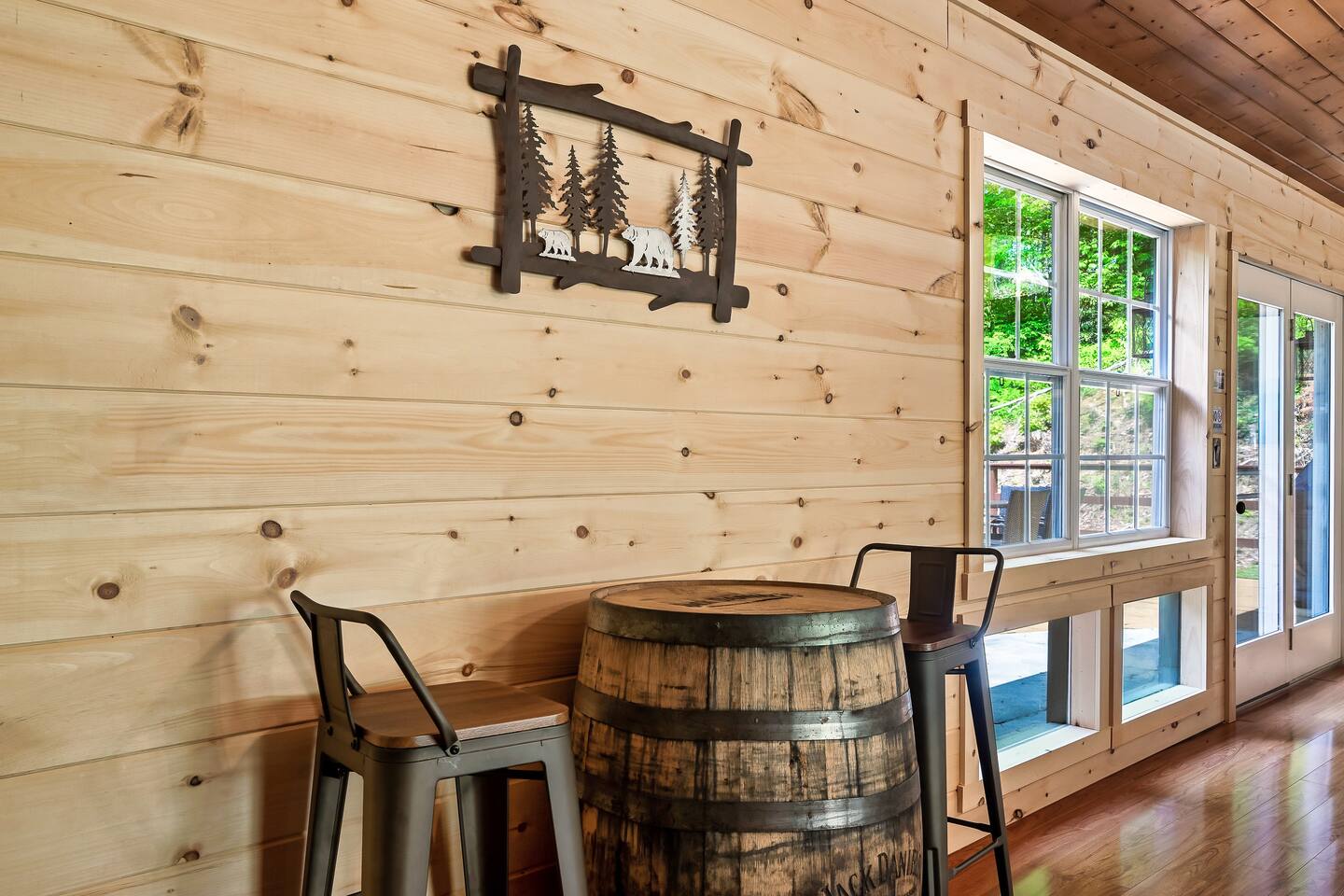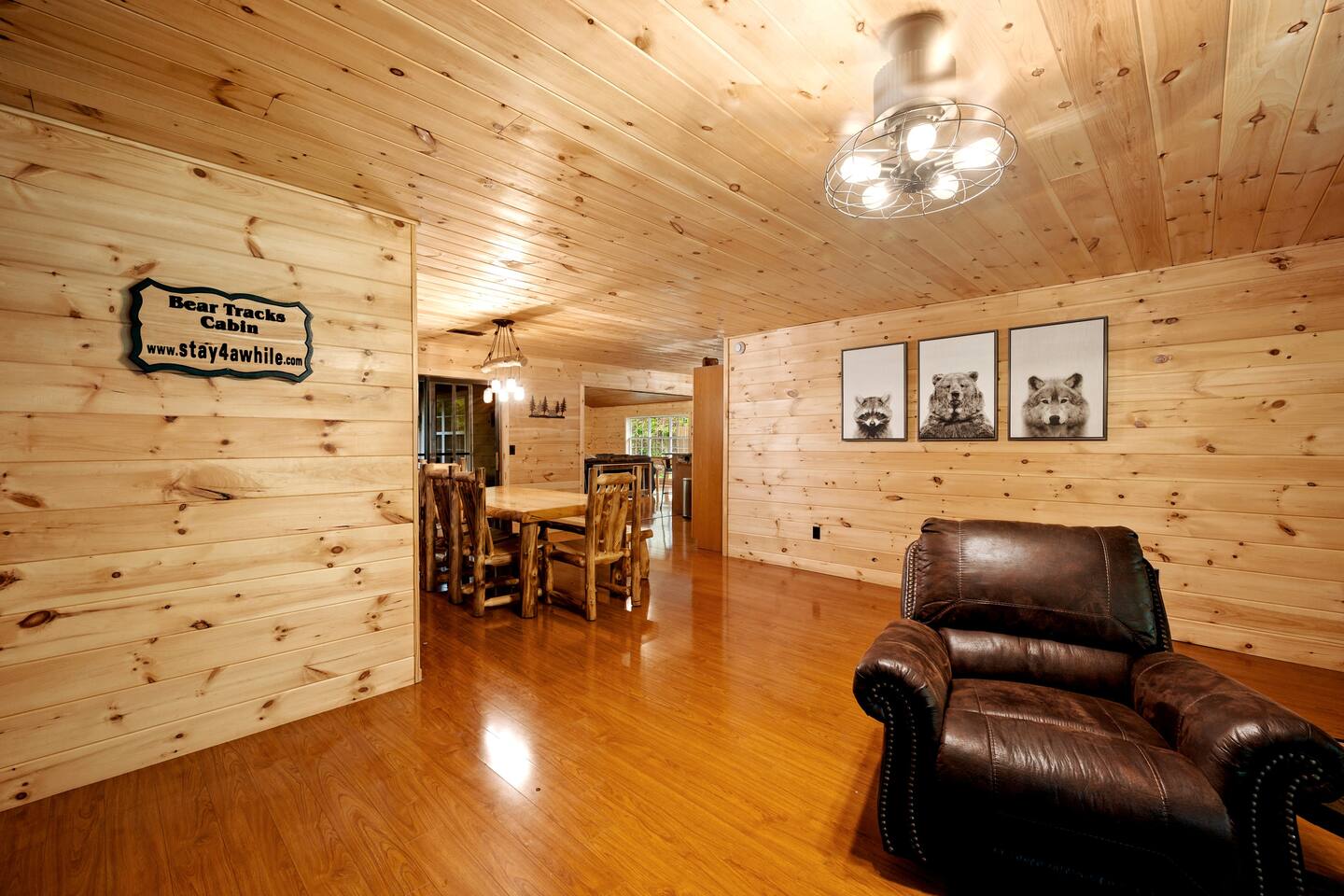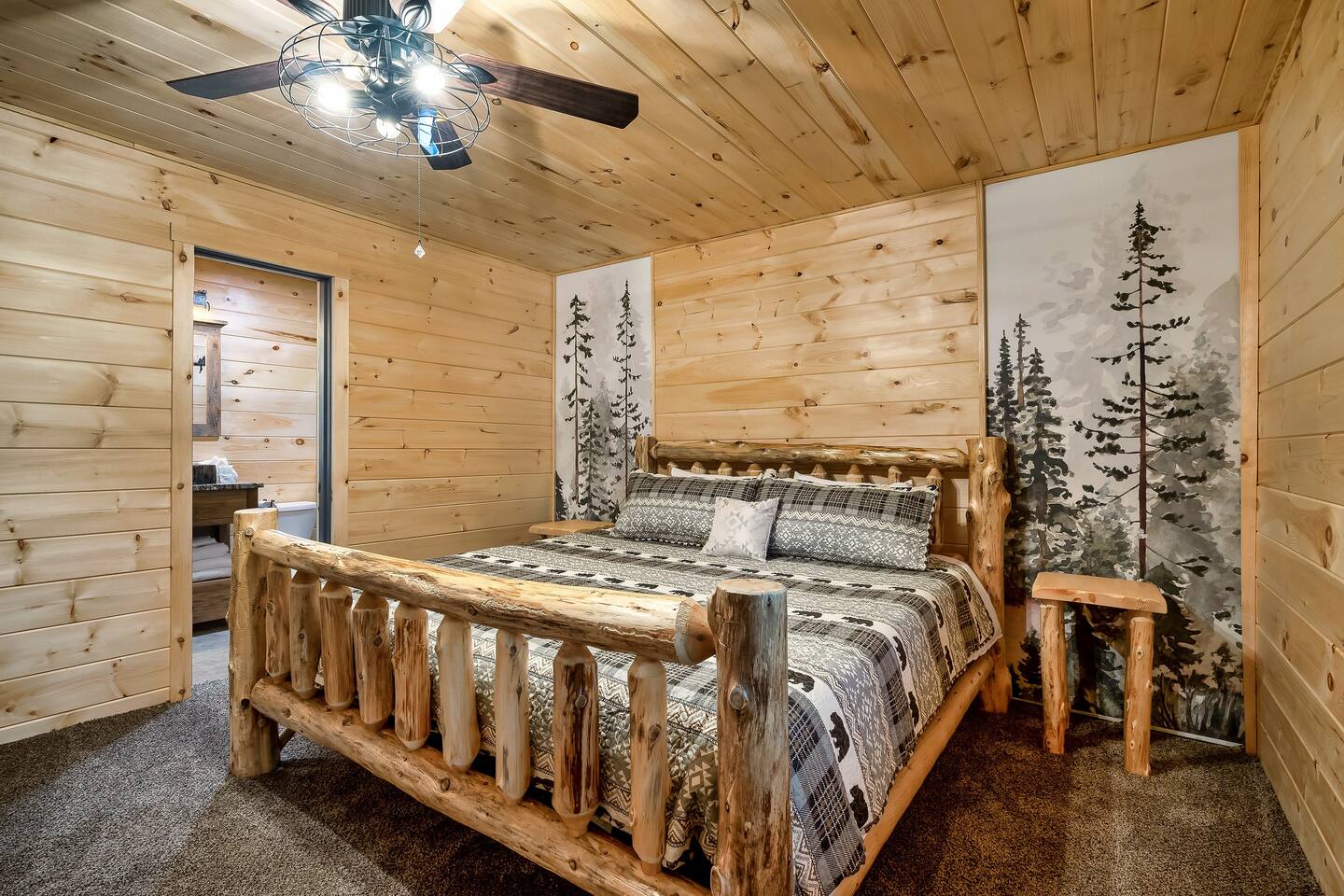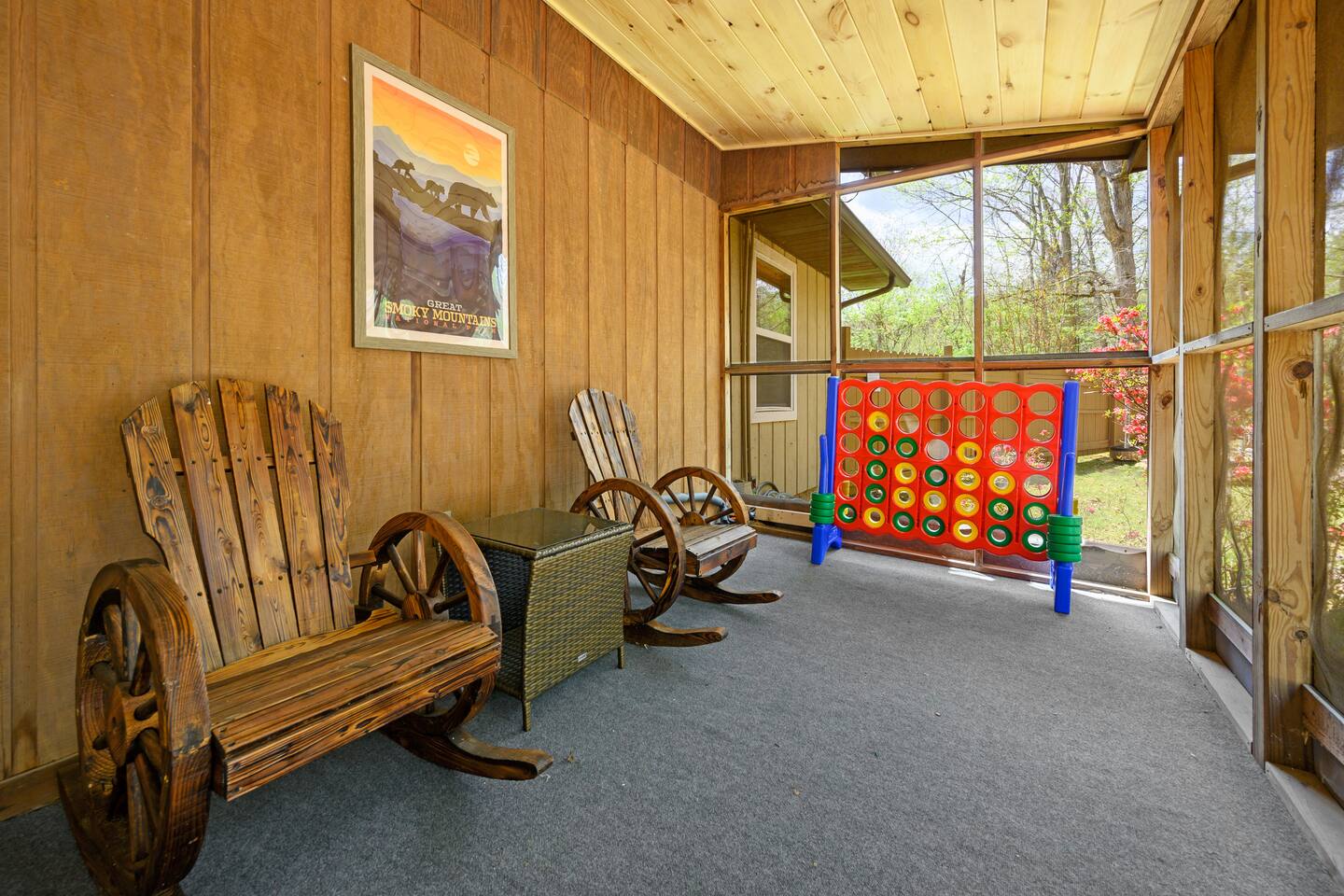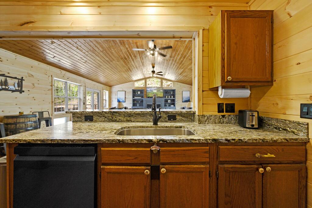 MINI-GOLF AND EXCELLENT RECREATION AREAS One of the best things about the cabin is its amenities and location! You never need to leave the cabin to enjoy your vacation with a huge, unique recreation room, semi-private, 5-hole mini-golf course, two large shared outdoor play areas, two private decks, a stunning backyard for your mountain getaway with firepit, large hot tub, string lights, outdoor games and more! Indoor there is a big buck hunter arcade game, classic pool table, foosball table, air hockey table, custom log wood poker/game table, large HD TVs, multi-cade arcade game, and board games all included in your stay! This cabin is located in the Gatlinburg Arts & Crafts district and a very short 3.4 mile drive from the main Gatlinburg parkway. Mini-Golf Course, play house and Playset: • Adjacent to the cabin is a 5-hole, professional grade, mini-golf course! • A 30-foot, wooden train play set, hopscotch, and tire crawl is next to this mini-golf course and the cabin, perfect for a family play area. • Right up the hill from the golf course is a whimsical little play house for kids • The golf course, playset and play house are the only shared amenity. The golf course/playset/play house are shared only with you and two other cabins we manage next door! ALL OTHER CABIN AMENITIES BELOW ARE PRIVATE AND FOR YOUR EXCLUSIVE USE WHILE YOU STAY. Serene, Private, Mountain Backyard: • Private, surrounded by beautiful forest and lined with picturesque lights make the space feel magical • Large stone firepit with comfy Adirondack chairs & benches [firewood not provided] • Gas BBQ with propane provided • Outdoor dining table for 6 people and rocking chairs • Large hot tub • Screened porch connected to the house allowing you to enjoy the two rockers • Outdoor games include oversized connect four & corn hole Outstanding recreation room: • Big Buck Hunter Video Game (free for use during your stay) • Air hockey table • Large pool table • Foosball table • Custom log wood poker/game table with 4 log chairs, checkers and poker set • 75” HD TV and full cable service • Custom whiskey barrel arcade video game (no charge) with 60+ classic arcade games • Assorted board games LIVING ROOMS –There are two living rooms which are surrounded by hand crafted tongue and groove, knotty pine walls and ceiling. Both spaces are connected to the kitchen and dining room they have two gas fireplaces making them cozy. The dining area is anchored with custom log wood table with seating for eight and four bar stools at the kitchen bar. We have three plush leather couches and two rockers which really set both spaces apart as a place to watch TV, relax and enjoy the mountains! This space is warm, cozy and ready for you to relax and enjoy the mountains or binge watch from the 60" HD Flat Screen TV. BEDROOMS The cabin sleeps up to 12 guests with 4 bedrooms and a queen mattress pull out sofa in the living room. Each bedroom is appointed with beautiful Smoky Mountain themed quilts, hand crafted log frame beds and cozy comforters. Two of the bedrooms are suites with full bathrooms attached to the bedroom. King Suite 1: • King Bedroom Suite & HD TV • Full bathroom with shower and bathtub combo King Suite 2: • King Bedroom Suite & HDTV • Bathroom with walk in shower • Large walk-in closet Bedroom 3 Bunk Room (Sleeps 4 – 2 bunks, 4 beds): • Twin bed, log wood bunk bed • Twin bed, log wood bunk bed Bedroom 4 (Sleeps 4): • King bed & HD TV • Twin bunk bed DINING ROOM – Custom log-wood dining table with seating for 8 right next to the kitchen bar with seating for 4 more. The deck connected to the kitchen & living room also has an outdoor dining table perfect for 6 to enjoy dinner and two large rocking chairs KITCHEN – Well-appointed with all the major utensils, silverware, dishes, glasses and cookware needed for you to create & serve gourmet meals. Electric stove, oven, microwave, refrigerator, dishwasher, Keurig coffee maker, drip coffee maker, toaster, blender, etc. ADDITIONAL AMENITIES – • Full size washer and dryer • Convenient location right in the Gatlinburg Arts & Crafts Community and only 3.4 miles away from the downtown Parkway! Easy access to great restaurants, shopping, Ripley's Aquarium, & the entrance to The Great Smoky Mountains National Park all only 4 miles away. • Convenient access to Pigeon Forge, only 7.8 miles away! • Only 11 miles away from the entrance to Dollywood/Splash Country! • Just minutes from this cabin is the beautiful Gatlinburg Community Center - a complex with indoor swimming pool, basketball court, ping pong, bowling alley, weight room and showers. For a very reasonable fee visitors are welcome to take advantage of this beautiful complex. • Convenient paved parking with plenty of space for 5 standard size SUVs. No RV or trailer parking permitted. • Heating & A/C