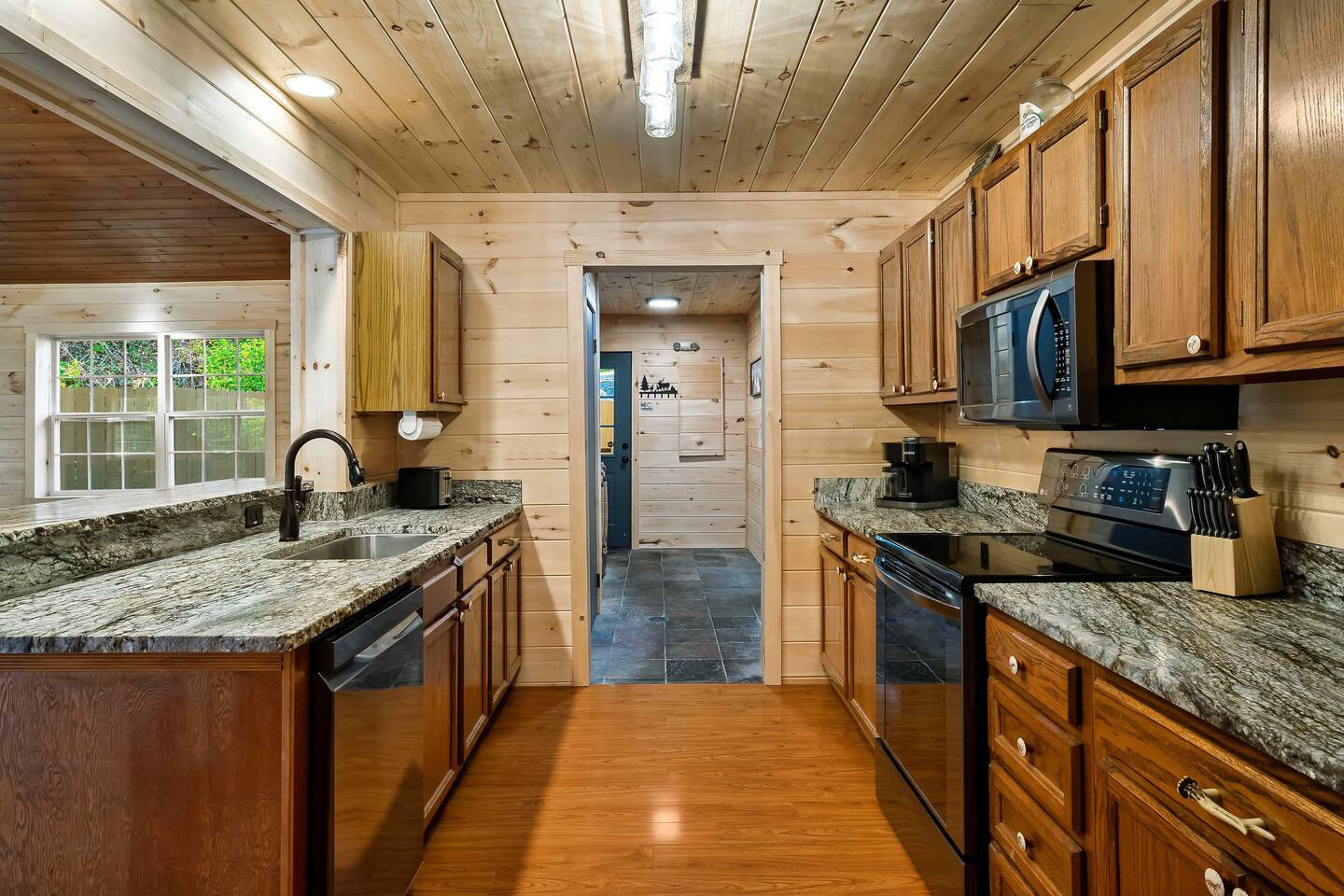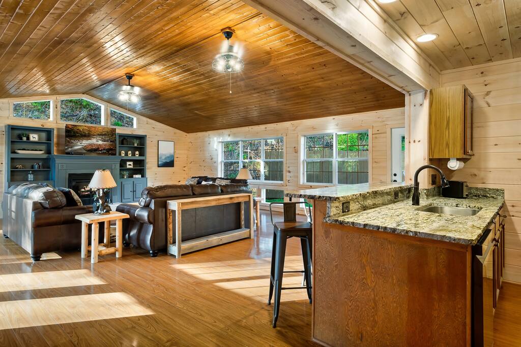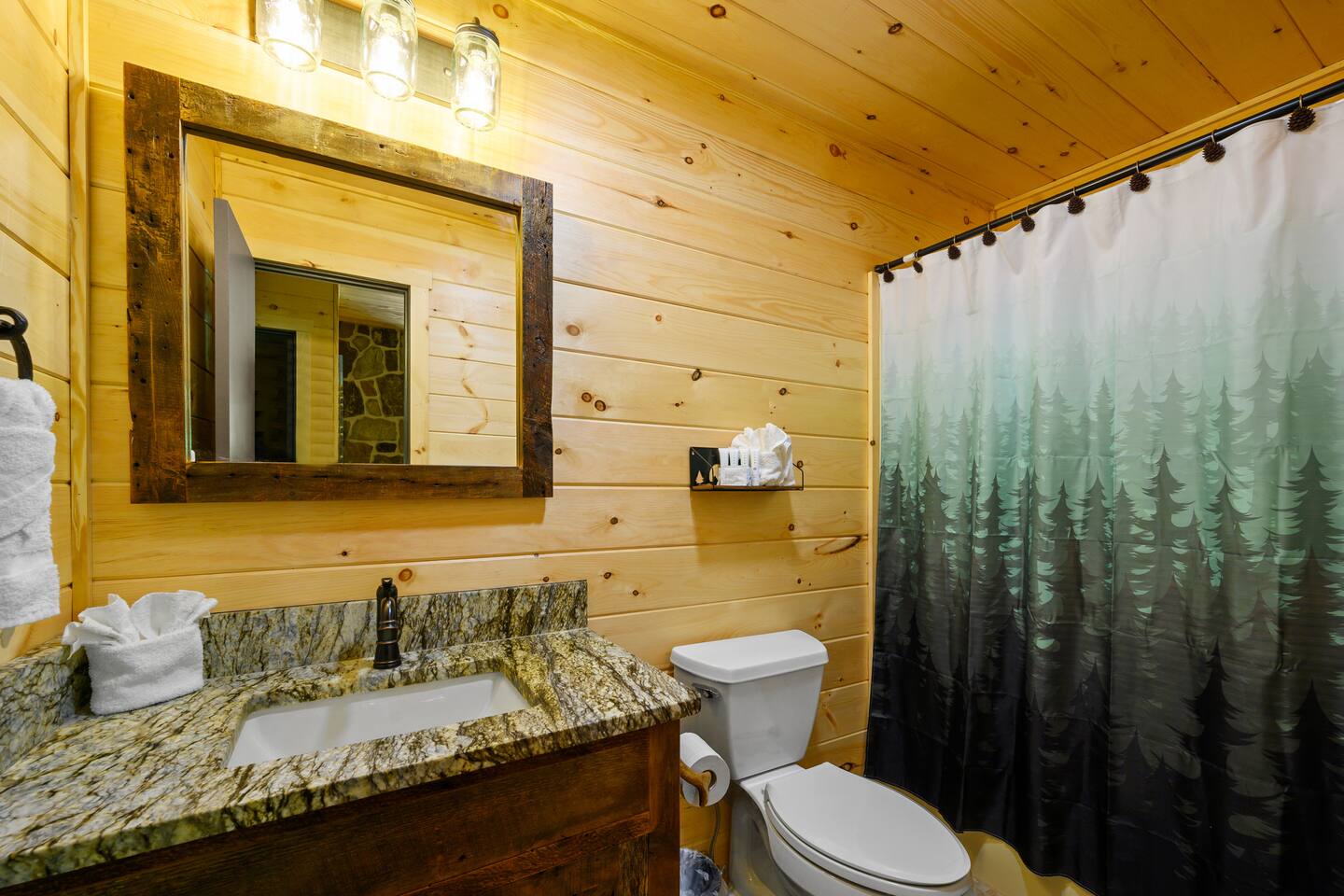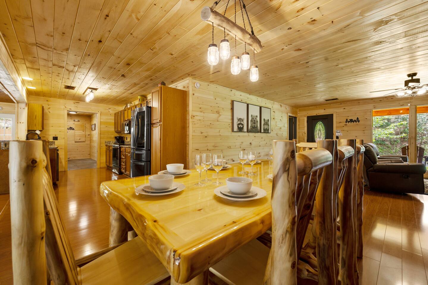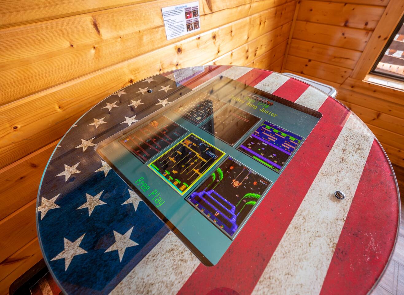 MINI-GOLF AND EXCELLENT RECREATION AREAS One of the best things about the cabin is its amenities and location! You never need to leave the cabin to enjoy your vacation with a huge, unique recreation room, semi-private, 5-hole mini-golf course, two large shared outdoor play areas, two private decks, a stunning backyard for your mountain getaway with firepit, large hot tub, string lights, outdoor games and more! Indoor there is a big buck hunter arcade game, classic pool table, foosball table, air hockey table, custom log wood poker/game table, large HD TVs, multi-cade arcade game, and board games all included in your stay! This cabin is located in the Gatlinburg Arts & Crafts district and a very short 3.4 mile drive from the main Gatlinburg parkway. Mini-Golf Course, play house and Playset: • Adjacent to the cabin is a 5-hole, professional grade, mini-golf course! • A 30-foot, wooden train play set, hopscotch, and tire crawl is next to this mini-golf course and the cabin, perfect for a family play area. • Right up the hill from the golf course is a whimsical little play house for kids • The golf course, playset and play house are the only shared amenity. The golf course/playset/play house are shared only with you and two other cabins we manage next door! ALL OTHER CABIN AMENITIES BELOW ARE PRIVATE AND FOR YOUR EXCLUSIVE USE WHILE YOU STAY. Serene, Private, Mountain Backyard: • Private, surrounded by beautiful forest and lined with picturesque lights make the space feel magical • Large stone firepit with comfy Adirondack chairs & benches [firewood not provided] • Gas BBQ with propane provided • Outdoor dining table for 6 people and rocking chairs • Large hot tub • Screened porch connected to the house allowing you to enjoy the two rockers • Outdoor games include oversized connect four & corn hole Outstanding recreation room: • Big Buck Hunter Video Game (free for use during your stay) • Air hockey table • Large pool table • Foosball table • Custom log wood poker/game table with 4 log chairs, checkers and poker set • 75” HD TV and full cable service • Custom whiskey barrel arcade video game (no charge) with 60+ classic arcade games • Assorted board games LIVING ROOMS –There are two living rooms which are surrounded by hand crafted tongue and groove, knotty pine walls and ceiling. Both spaces are connected to the kitchen and dining room they have two gas fireplaces making them cozy. The dining area is anchored with custom log wood table with seating for eight and four bar stools at the kitchen bar. We have three plush leather couches and two rockers which really set both spaces apart as a place to watch TV, relax and enjoy the mountains! This space is warm, cozy and ready for you to relax and enjoy the mountains or binge watch from the 60" HD Flat Screen TV. BEDROOMS The cabin sleeps up to 12 guests with 4 bedrooms and a queen mattress pull out sofa in the living room. Each bedroom is appointed with beautiful Smoky Mountain themed quilts, hand crafted log frame beds and cozy comforters. Two of the bedrooms are suites with full bathrooms attached to the bedroom. King Suite 1: • King Bedroom Suite & HD TV • Full bathroom with shower and bathtub combo King Suite 2: • King Bedroom Suite & HDTV • Bathroom with walk in shower • Large walk-in closet Bedroom 3 Bunk Room (Sleeps 4 – 2 bunks, 4 beds): • Twin bed, log wood bunk bed • Twin bed, log wood bunk bed Bedroom 4 (Sleeps 4): • King bed & HD TV • Twin bunk bed DINING ROOM – Custom log-wood dining table with seating for 8 right next to the kitchen bar with seating for 4 more. The deck connected to the kitchen & living room also has an outdoor dining table perfect for 6 to enjoy dinner and two large rocking chairs KITCHEN – Well-appointed with all the major utensils, silverware, dishes, glasses and cookware needed for you to create & serve gourmet meals. Electric stove, oven, microwave, refrigerator, dishwasher, Keurig coffee maker, drip coffee maker, toaster, blender, etc. ADDITIONAL AMENITIES – • Full size washer and dryer • Convenient location right in the Gatlinburg Arts & Crafts Community and only 3.4 miles away from the downtown Parkway! Easy access to great restaurants, shopping, Ripley's Aquarium, & the entrance to The Great Smoky Mountains National Park all only 4 miles away. • Convenient access to Pigeon Forge, only 7.8 miles away! • Only 11 miles away from the entrance to Dollywood/Splash Country! • Just minutes from this cabin is the beautiful Gatlinburg Community Center - a complex with indoor swimming pool, basketball court, ping pong, bowling alley, weight room and showers. For a very reasonable fee visitors are welcome to take advantage of this beautiful complex. • Convenient paved parking with plenty of space for 5 standard size SUVs. No RV or trailer parking permitted. • Heating & A/C