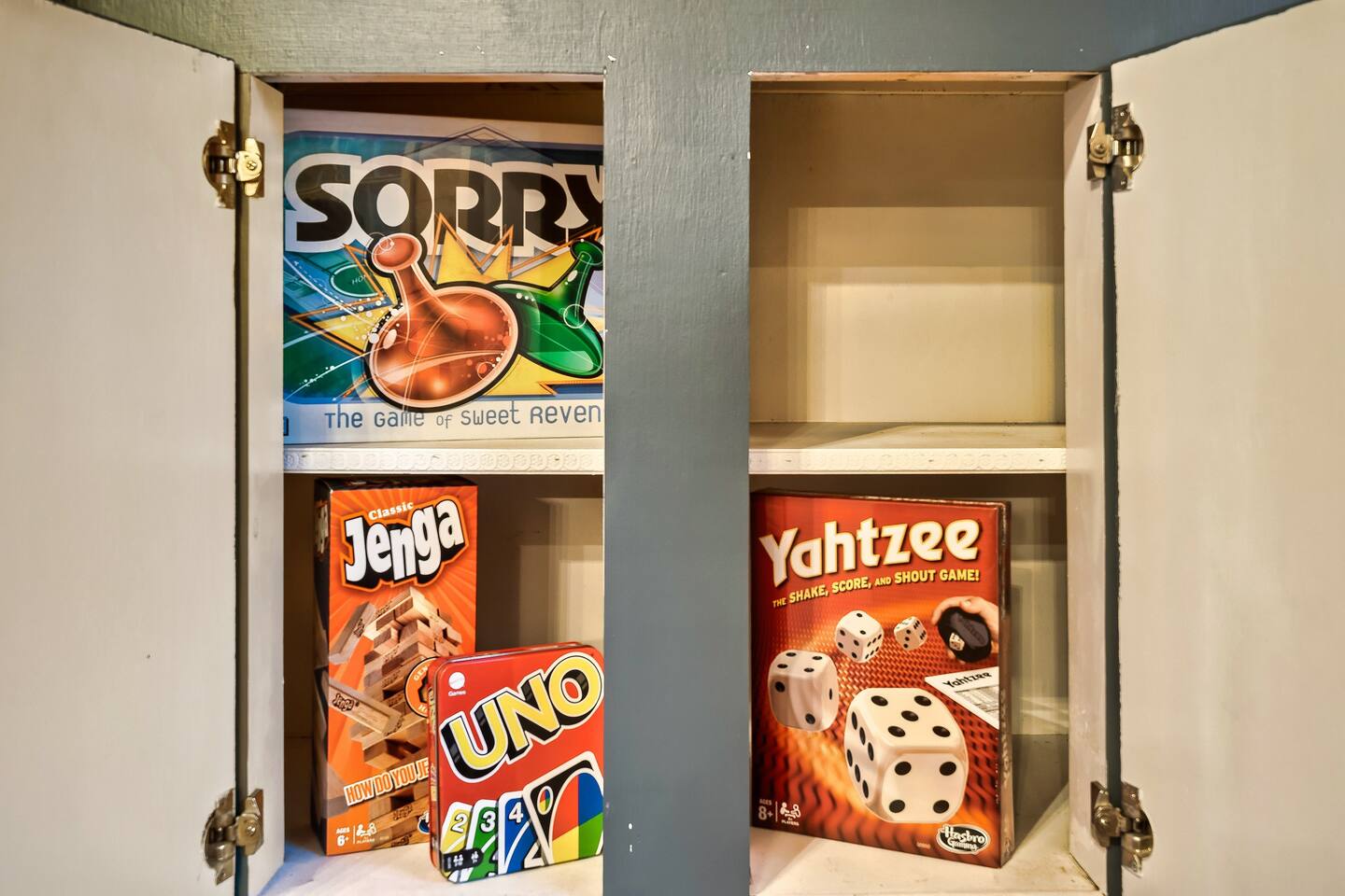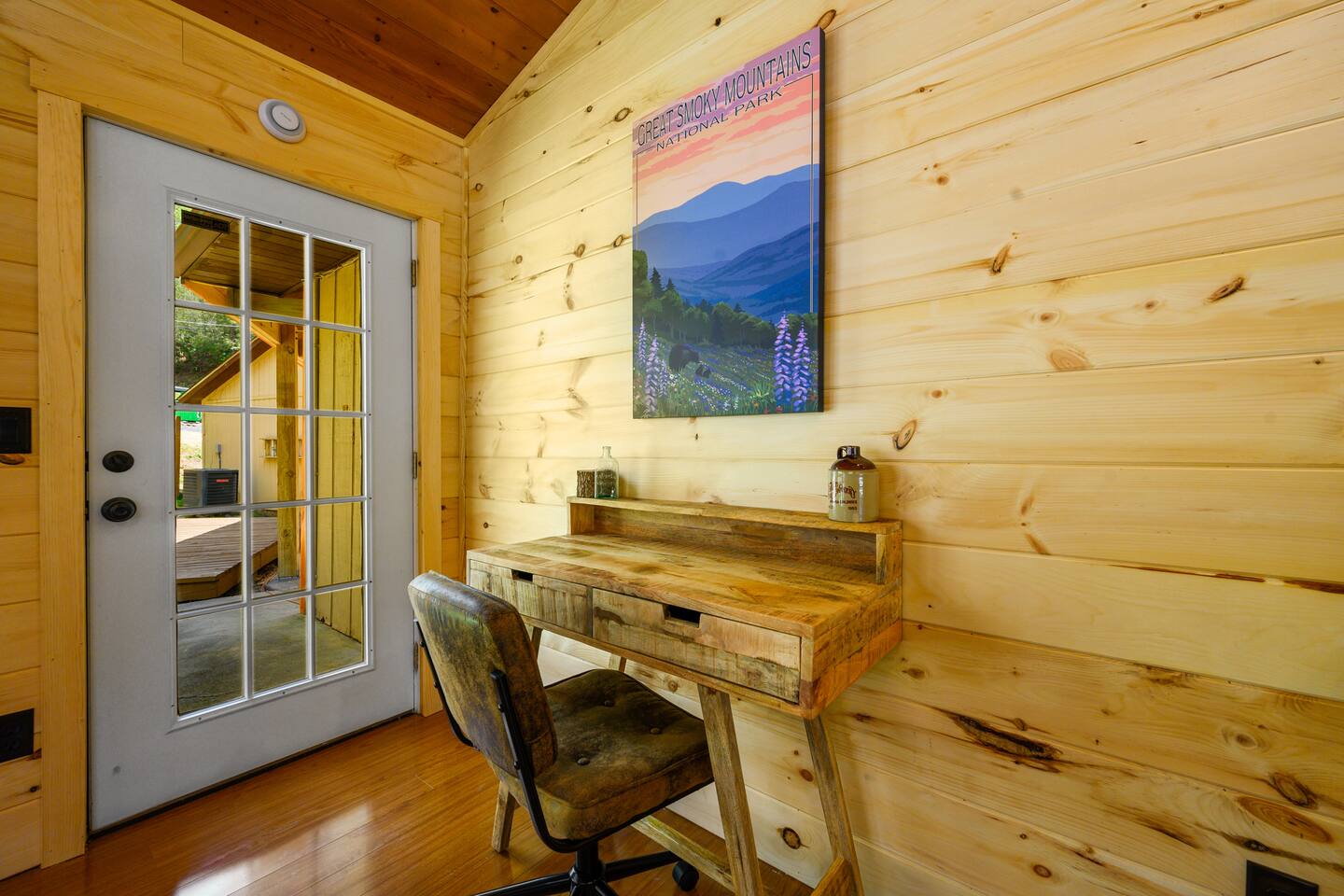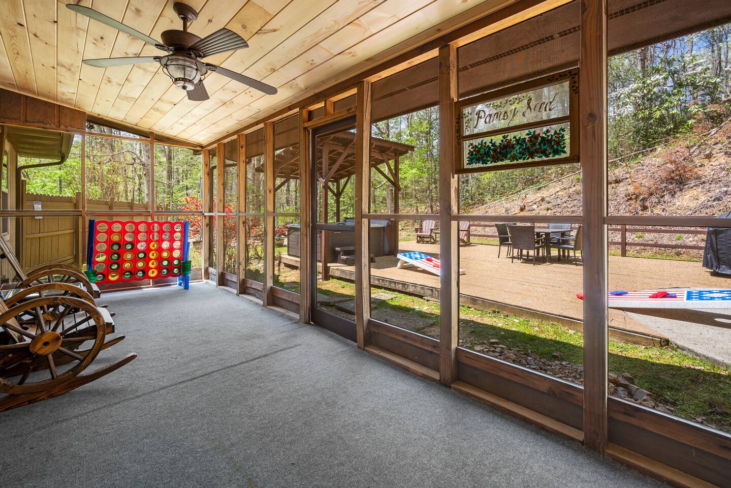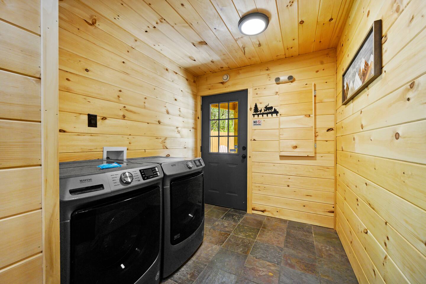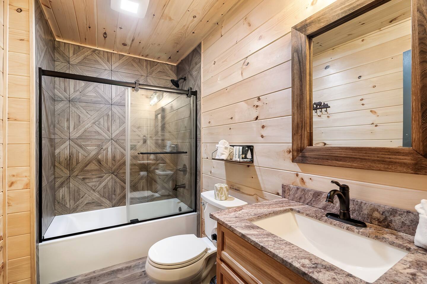 MINI-GOLF AND EXCELLENT RECREATION AREAS One of the best things about the cabin is its amenities and location! You never need to leave the cabin to enjoy your vacation with a huge, unique recreation room, semi-private, 5-hole mini-golf course, two large shared outdoor play areas, two private decks, a stunning backyard for your mountain getaway with firepit, large hot tub, string lights, outdoor games and more! Indoor there is a big buck hunter arcade game, classic pool table, foosball table, air hockey table, custom log wood poker/game table, large HD TVs, multi-cade arcade game, and board games all included in your stay! This cabin is located in the Gatlinburg Arts & Crafts district and a very short 3.4 mile drive from the main Gatlinburg parkway. Mini-Golf Course, play house and Playset: • Adjacent to the cabin is a 5-hole, professional grade, mini-golf course! • A 30-foot, wooden train play set, hopscotch, and tire crawl is next to this mini-golf course and the cabin, perfect for a family play area. • Right up the hill from the golf course is a whimsical little play house for kids • The golf course, playset and play house are the only shared amenity. The golf course/playset/play house are shared only with you and two other cabins we manage next door! ALL OTHER CABIN AMENITIES BELOW ARE PRIVATE AND FOR YOUR EXCLUSIVE USE WHILE YOU STAY. Serene, Private, Mountain Backyard: • Private, surrounded by beautiful forest and lined with picturesque lights make the space feel magical • Large stone firepit with comfy Adirondack chairs & benches [firewood not provided] • Gas BBQ with propane provided • Outdoor dining table for 6 people and rocking chairs • Large hot tub • Screened porch connected to the house allowing you to enjoy the two rockers • Outdoor games include oversized connect four & corn hole Outstanding recreation room: • Big Buck Hunter Video Game (free for use during your stay) • Air hockey table • Large pool table • Foosball table • Custom log wood poker/game table with 4 log chairs, checkers and poker set • 75” HD TV and full cable service • Custom whiskey barrel arcade video game (no charge) with 60+ classic arcade games • Assorted board games LIVING ROOMS –There are two living rooms which are surrounded by hand crafted tongue and groove, knotty pine walls and ceiling. Both spaces are connected to the kitchen and dining room they have two gas fireplaces making them cozy. The dining area is anchored with custom log wood table with seating for eight and four bar stools at the kitchen bar. We have three plush leather couches and two rockers which really set both spaces apart as a place to watch TV, relax and enjoy the mountains! This space is warm, cozy and ready for you to relax and enjoy the mountains or binge watch from the 60" HD Flat Screen TV. BEDROOMS The cabin sleeps up to 12 guests with 4 bedrooms and a queen mattress pull out sofa in the living room. Each bedroom is appointed with beautiful Smoky Mountain themed quilts, hand crafted log frame beds and cozy comforters. Two of the bedrooms are suites with full bathrooms attached to the bedroom. King Suite 1: • King Bedroom Suite & HD TV • Full bathroom with shower and bathtub combo King Suite 2: • King Bedroom Suite & HDTV • Bathroom with walk in shower • Large walk-in closet Bedroom 3 Bunk Room (Sleeps 4 – 2 bunks, 4 beds): • Twin bed, log wood bunk bed • Twin bed, log wood bunk bed Bedroom 4 (Sleeps 4): • King bed & HD TV • Twin bunk bed DINING ROOM – Custom log-wood dining table with seating for 8 right next to the kitchen bar with seating for 4 more. The deck connected to the kitchen & living room also has an outdoor dining table perfect for 6 to enjoy dinner and two large rocking chairs KITCHEN – Well-appointed with all the major utensils, silverware, dishes, glasses and cookware needed for you to create & serve gourmet meals. Electric stove, oven, microwave, refrigerator, dishwasher, Keurig coffee maker, drip coffee maker, toaster, blender, etc. ADDITIONAL AMENITIES – • Full size washer and dryer • Convenient location right in the Gatlinburg Arts & Crafts Community and only 3.4 miles away from the downtown Parkway! Easy access to great restaurants, shopping, Ripley's Aquarium, & the entrance to The Great Smoky Mountains National Park all only 4 miles away. • Convenient access to Pigeon Forge, only 7.8 miles away! • Only 11 miles away from the entrance to Dollywood/Splash Country! • Just minutes from this cabin is the beautiful Gatlinburg Community Center - a complex with indoor swimming pool, basketball court, ping pong, bowling alley, weight room and showers. For a very reasonable fee visitors are welcome to take advantage of this beautiful complex. • Convenient paved parking with plenty of space for 5 standard size SUVs. No RV or trailer parking permitted. • Heating & A/C