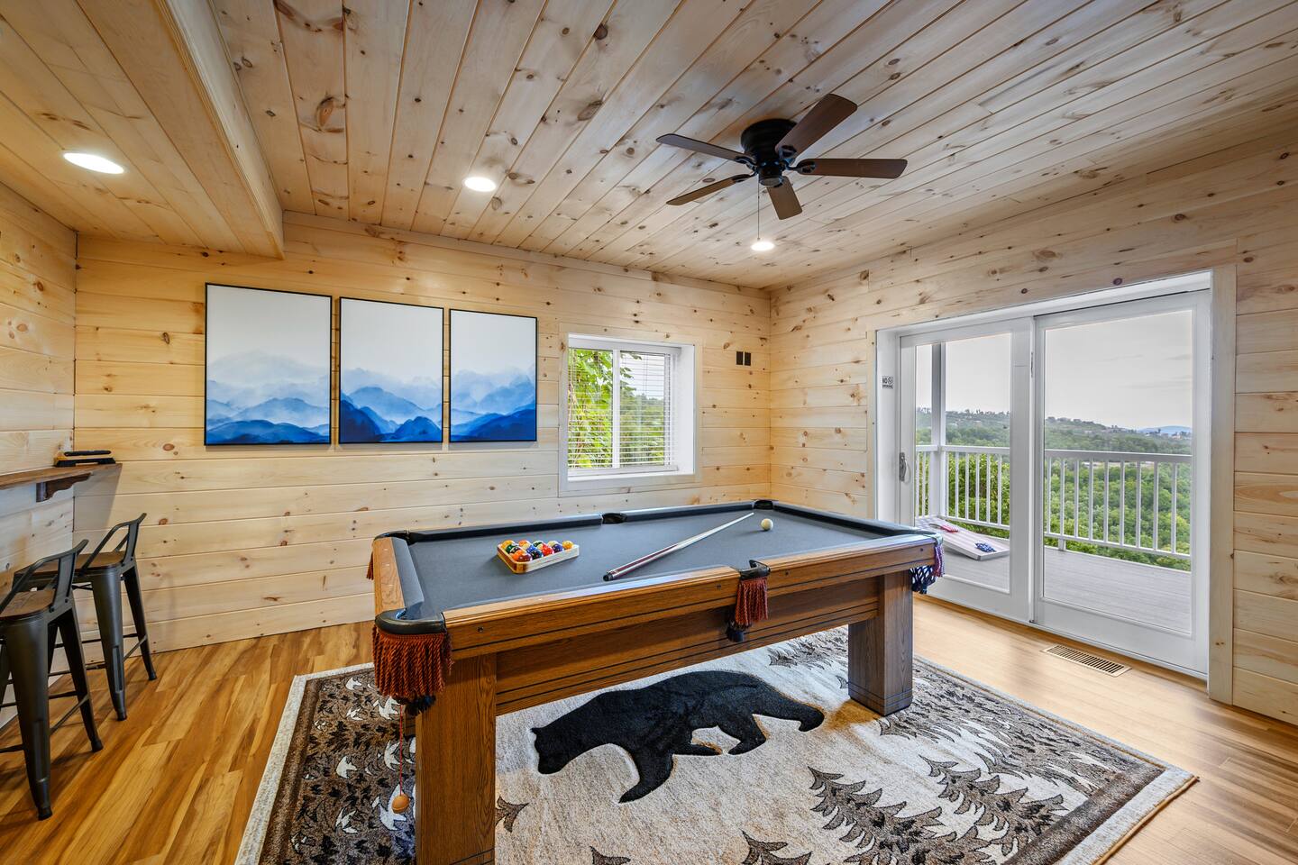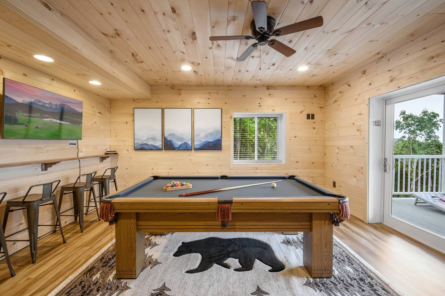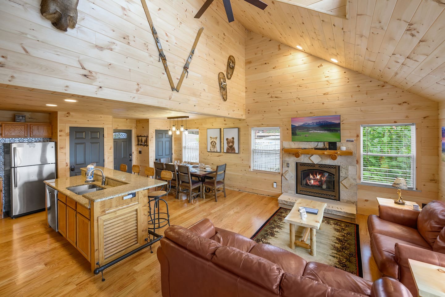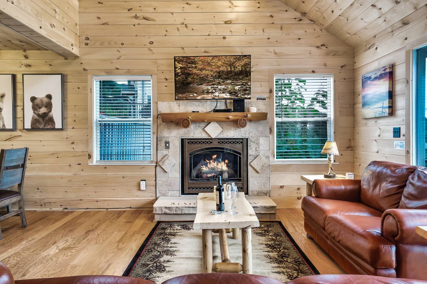 Plan your perfect holiday escape at our cozy cabin, where crisp mountain air, sparkling lights, and festive cheer set the scene for an unforgettable getaway. Gather by the fire, sip hot cocoa as the snow falls, and soak in the magic of the season from the porch. Your winter wonderland retreat is waiting. Come make it yours! LIVING ROOM – Awe-inspiring view right when you walk in the door of the Papa Bear Chalet living room stops you in your tracks! The panoramic views of Downtown Gatlinburg, Ober Gatlinburg Gondola & the Great Smoky Mountains are just stunning! The living room connects to the kitchen and dining room with beautiful, two-story knotty pine wood walls, a gas fireplace, and a dining area setting this great room apart and making it perfect for entertaining! It is warm, cozy, and ready for you to relax and enjoy the views or binge-watch from the 50" HD Flat Screen TV & plush leather couches. Fireplace season is October through March. EXCELLENT RECREATION AREAS You never need to leave the chalet to enjoy your vacation with an excellent recreation room and two private decks to enjoy! There is a classic pool table and whiskey barrel arcade game, board games, and 50” HD TVs! The lower floor of the chalet has a game room complete with: • Pool table • Custom whiskey barrel arcade video game (no charge) with 60+ classic arcade games • Assorted board games • Hot Tub with 7-person capacity outside the game room • 50” HD TV with full cable service • Large outdoor deck with 2 rocking chairs and a stunning view • Corn hole game for outdoor use Main floor: • Living room with 50” HD TV and full cable service & gas fireplace (available Oct-March) • Exterior deck with breathtaking panoramic views of the downtown, the Ober Gatlinburg Gondola & the Great Smoky Mountains BEDROOMS The chalet sleeps up to 12 guests with 4 bedrooms and two queen mattress pull-out sofas in the living room. Each bedroom is appointed with beautiful Smoky Mountain-themed quilts, handcrafted log frame beds, and cozy comforters. Two of the bedrooms are suites with full bathrooms attached to the bedrooms. Lower floor (sleeps 4 people): • Bedroom with King bed & HD TV with full cable service • Bedroom with Queen bed • Full bathroom with shower/bathtub combo Main floor (sleeps 4 people): • Master bedroom suite with King bed, HDTV with cable, and attached full bathroom with tub/shower combination • Living room with two queen pull-out sofa beds Top floor (sleeps 4 people): • Master Bedroom suite with King bed, bunk bed (2 twin beds), and HD TV with full cable service • Bathroom with tub and shower DECKS - 2 decks off the back of the chalet with dining table, premium seating, hot tub, and stunning views DINING ROOM – Rustic wooden dining table with seating for 8 right near the kitchen bar with seating for 4 more. The deck connected to the kitchen & living room also has an outdoor dining table perfect for 6 to enjoy dinner and two large high-back Adirondack chairs. KITCHEN – Well-appointed with all the major utensils, silverware, dishes, glasses, and cookware needed for you to create & serve gourmet meals. Electric stove, oven, microwave, refrigerator, dishwasher, Keurig coffee maker, drip coffee maker, toaster, blender, etc. ADDITIONAL AMENITIES – • Access to Chalet Village Facilities which include 3 different club houses, three separate pool facilities including water-slide, children’s play fountain, four tennis courts, two game rooms with pool table, foosball, air hockey, arcade games, children’s play structure, concession stands & more. These facilities are included with your stay, with seasonal swimming pools available from Memorial Day through Labor Day. • High-speed Wi-Fi • Pet friendly with a fee • Full-size washer and dryer access • Convenient location to downtown Gatlinburg, only 2.4 miles away and 2.2 miles to the entrance to Ober Gatlinburg! Easy access to great restaurants, shopping, Ripley's Aquarium, & the entrance to The Great Smoky Mountains National Park, all only a 7-10 minute drive (2.4 miles) away. • Convenient access to Pigeon Forge, less than 9 miles away, with access to the Gatlinburg bypass, which allows you to avoid the peak season traffic in Gatlinburg on your way to the Pigeon Forge attractions • Only 12 miles away from the entrance to Dollywood/Splash Country! • Just minutes from this chalet is the beautiful Gatlinburg Community Center - a complex with an indoor swimming pool, basketball court, ping pong, bowling alley, weight room, and showers. For a very reasonable fee, visitors are welcome to take advantage of this beautiful complex. • Convenient paved parking with plenty of space for 4+ standard-size SUVs. No RV or trailer parking permitted. • Heating & A/C • Weber gas grill – connected to the mainline so no worry about propane running out • We provide a set of starter supplies to allow you to get settled when you arrive. They include 2 trash bags, 2 dishwasher pods, a paper towel roll, a small liquid dish soap bottle, a toilet paper, a small bottle of shampoo, body lotion, body wash, conditioner and a soap bar for each bathroom, towels, and bed linens. They are designed so that you are all set when you arrive but not to last the entire trip. • Our close proximity to the Great Smoky Mountain National Park means there is lots of wildlife in our area - black bears, deer, wild turkeys, raccoons, coyotes, fox, and more! Black bears visit the cabin often in Spring, Summer and Fall. You may get lucky and catch a glimpse of one of these residents while enjoying the view from the deck. We also contract regular monthly pest services which treat for all pests from multiple types of bugs, mice, etc. Despite our regular treatments, given the proximity of the cabin to the park, it is possible these pests can temporarily enter the cabin. We immediately respond and treat if anything comes up and have found it is rare to come across an