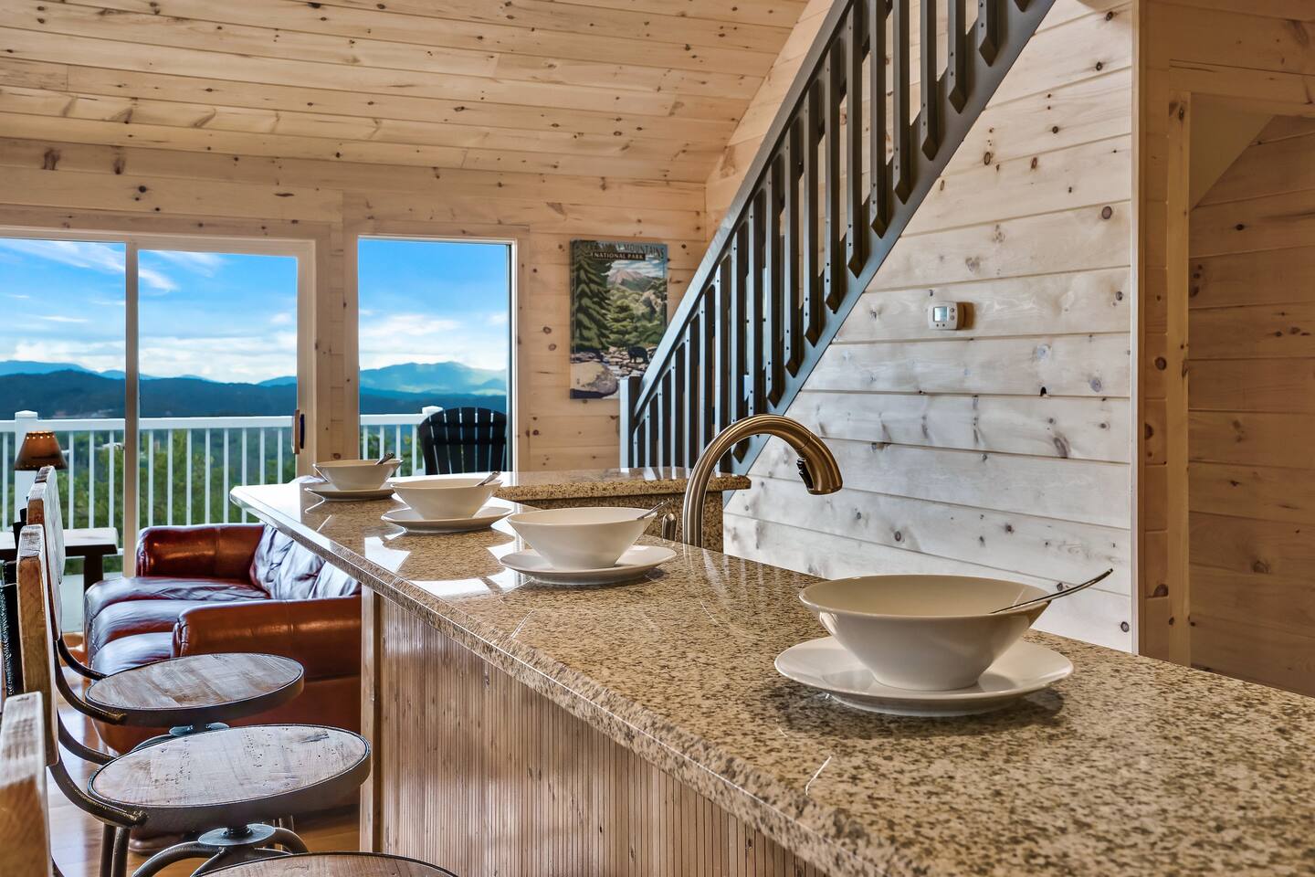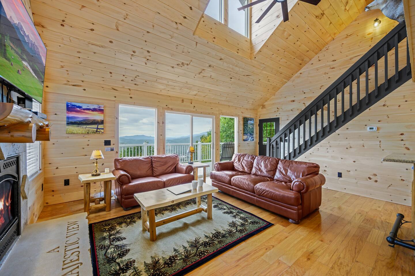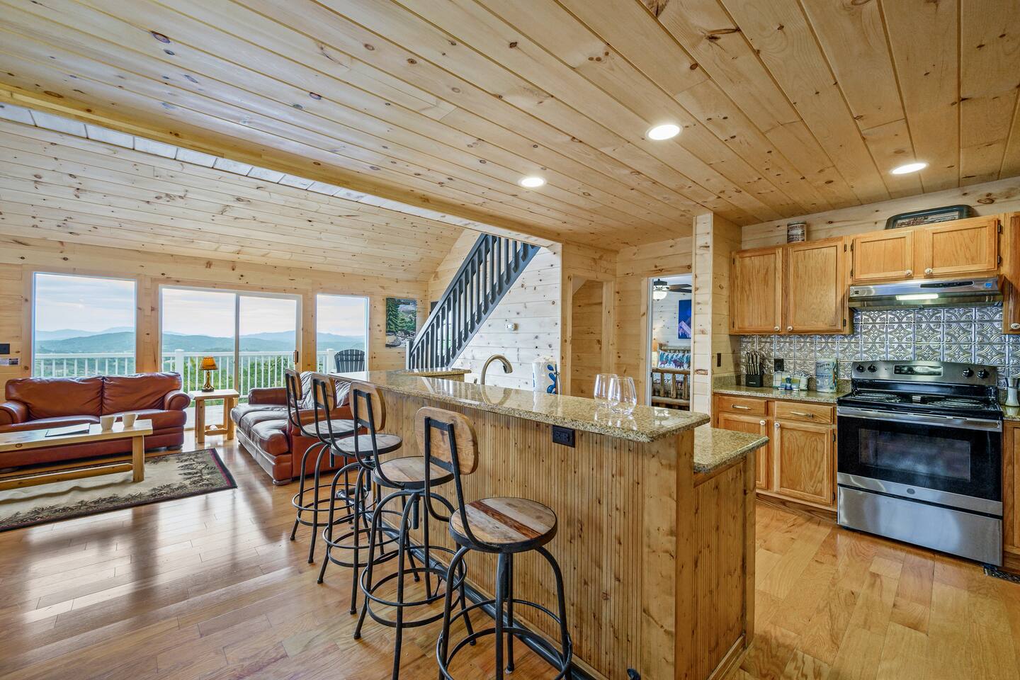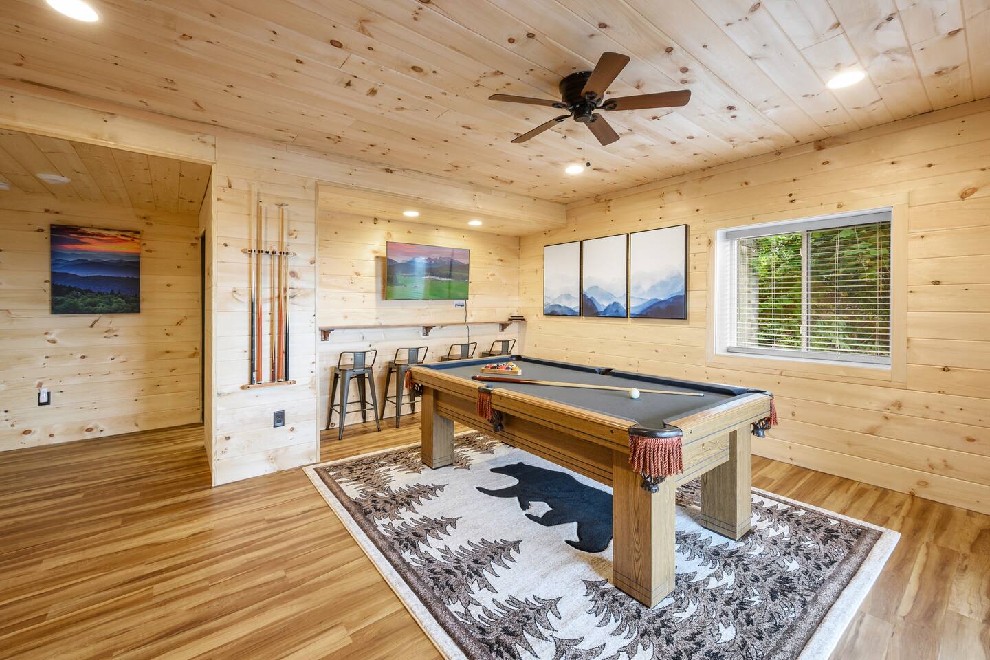 Plan your perfect holiday escape at our cozy cabin, where crisp mountain air, sparkling lights, and festive cheer set the scene for an unforgettable getaway. Gather by the fire, sip hot cocoa as the snow falls, and soak in the magic of the season from the porch. Your winter wonderland retreat is waiting. Come make it yours! LIVING ROOM – Awe-inspiring view right when you walk in the door of the Papa Bear Chalet living room stops you in your tracks! The panoramic views of Downtown Gatlinburg, Ober Gatlinburg Gondola & the Great Smoky Mountains are just stunning! The living room connects to the kitchen and dining room with beautiful, two-story knotty pine wood walls, a gas fireplace, and a dining area setting this great room apart and making it perfect for entertaining! It is warm, cozy, and ready for you to relax and enjoy the views or binge-watch from the 50" HD Flat Screen TV & plush leather couches. Fireplace season is October through March. EXCELLENT RECREATION AREAS You never need to leave the chalet to enjoy your vacation with an excellent recreation room and two private decks to enjoy! There is a classic pool table and whiskey barrel arcade game, board games, and 50” HD TVs! The lower floor of the chalet has a game room complete with: • Pool table • Custom whiskey barrel arcade video game (no charge) with 60+ classic arcade games • Assorted board games • Hot Tub with 7-person capacity outside the game room • 50” HD TV with full cable service • Large outdoor deck with 2 rocking chairs and a stunning view • Corn hole game for outdoor use Main floor: • Living room with 50” HD TV and full cable service & gas fireplace (available Oct-March) • Exterior deck with breathtaking panoramic views of the downtown, the Ober Gatlinburg Gondola & the Great Smoky Mountains BEDROOMS The chalet sleeps up to 12 guests with 4 bedrooms and two queen mattress pull-out sofas in the living room. Each bedroom is appointed with beautiful Smoky Mountain-themed quilts, handcrafted log frame beds, and cozy comforters. Two of the bedrooms are suites with full bathrooms attached to the bedrooms. Lower floor (sleeps 4 people): • Bedroom with King bed & HD TV with full cable service • Bedroom with Queen bed • Full bathroom with shower/bathtub combo Main floor (sleeps 4 people): • Master bedroom suite with King bed, HDTV with cable, and attached full bathroom with tub/shower combination • Living room with two queen pull-out sofa beds Top floor (sleeps 4 people): • Master Bedroom suite with King bed, bunk bed (2 twin beds), and HD TV with full cable service • Bathroom with tub and shower DECKS - 2 decks off the back of the chalet with dining table, premium seating, hot tub, and stunning views DINING ROOM – Rustic wooden dining table with seating for 8 right near the kitchen bar with seating for 4 more. The deck connected to the kitchen & living room also has an outdoor dining table perfect for 6 to enjoy dinner and two large high-back Adirondack chairs. KITCHEN – Well-appointed with all the major utensils, silverware, dishes, glasses, and cookware needed for you to create & serve gourmet meals. Electric stove, oven, microwave, refrigerator, dishwasher, Keurig coffee maker, drip coffee maker, toaster, blender, etc. ADDITIONAL AMENITIES – • Access to Chalet Village Facilities which include 3 different club houses, three separate pool facilities including water-slide, children’s play fountain, four tennis courts, two game rooms with pool table, foosball, air hockey, arcade games, children’s play structure, concession stands & more. These facilities are included with your stay, with seasonal swimming pools available from Memorial Day through Labor Day. • High-speed Wi-Fi • Pet friendly with a fee • Full-size washer and dryer access • Convenient location to downtown Gatlinburg, only 2.4 miles away and 2.2 miles to the entrance to Ober Gatlinburg! Easy access to great restaurants, shopping, Ripley's Aquarium, & the entrance to The Great Smoky Mountains National Park, all only a 7-10 minute drive (2.4 miles) away. • Convenient access to Pigeon Forge, less than 9 miles away, with access to the Gatlinburg bypass, which allows you to avoid the peak season traffic in Gatlinburg on your way to the Pigeon Forge attractions • Only 12 miles away from the entrance to Dollywood/Splash Country! • Just minutes from this chalet is the beautiful Gatlinburg Community Center - a complex with an indoor swimming pool, basketball court, ping pong, bowling alley, weight room, and showers. For a very reasonable fee, visitors are welcome to take advantage of this beautiful complex. • Convenient paved parking with plenty of space for 4+ standard-size SUVs. No RV or trailer parking permitted. • Heating & A/C • Weber gas grill – connected to the mainline so no worry about propane running out • We provide a set of starter supplies to allow you to get settled when you arrive. They include 2 trash bags, 2 dishwasher pods, a paper towel roll, a small liquid dish soap bottle, a toilet paper, a small bottle of shampoo, body lotion, body wash, conditioner and a soap bar for each bathroom, towels, and bed linens. They are designed so that you are all set when you arrive but not to last the entire trip. • Our close proximity to the Great Smoky Mountain National Park means there is lots of wildlife in our area - black bears, deer, wild turkeys, raccoons, coyotes, fox, and more! Black bears visit the cabin often in Spring, Summer and Fall. You may get lucky and catch a glimpse of one of these residents while enjoying the view from the deck. We also contract regular monthly pest services which treat for all pests from multiple types of bugs, mice, etc. Despite our regular treatments, given the proximity of the cabin to the park, it is possible these pests can temporarily enter the cabin. We immediately respond and treat if anything comes up and have found it is rare to come across an