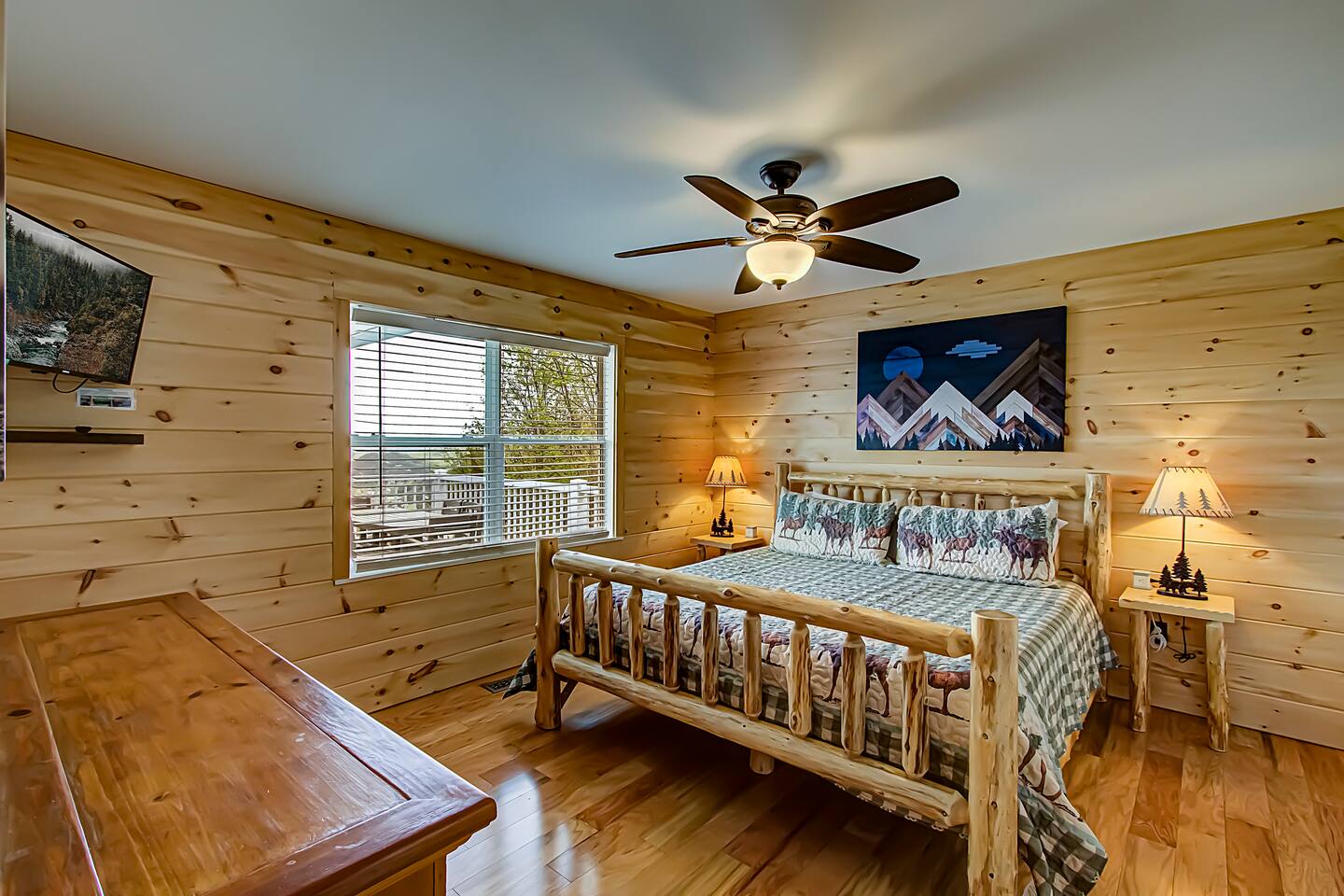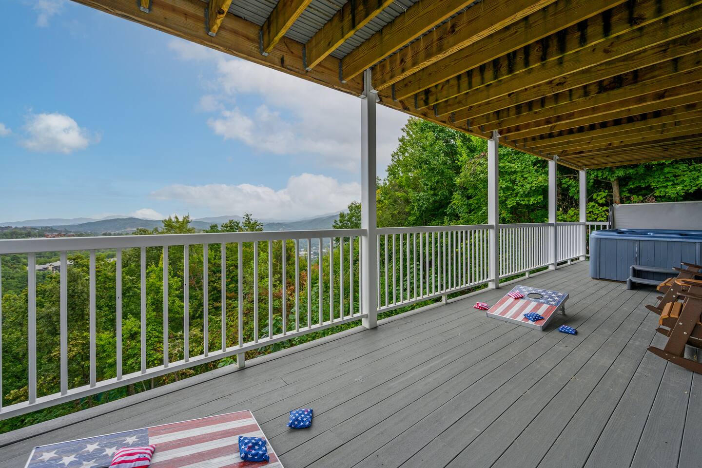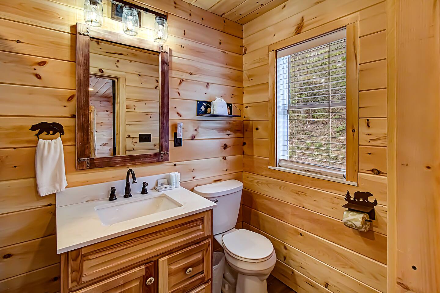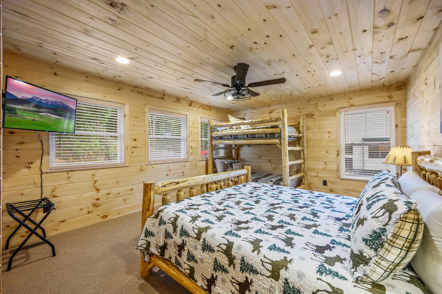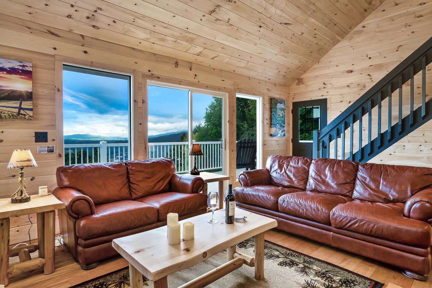 Plan your perfect holiday escape at our cozy cabin, where crisp mountain air, sparkling lights, and festive cheer set the scene for an unforgettable getaway. Gather by the fire, sip hot cocoa as the snow falls, and soak in the magic of the season from the porch. Your winter wonderland retreat is waiting. Come make it yours! LIVING ROOM – Awe-inspiring view right when you walk in the door of the Papa Bear Chalet living room stops you in your tracks! The panoramic views of Downtown Gatlinburg, Ober Gatlinburg Gondola & the Great Smoky Mountains are just stunning! The living room connects to the kitchen and dining room with beautiful, two-story knotty pine wood walls, a gas fireplace, and a dining area setting this great room apart and making it perfect for entertaining! It is warm, cozy, and ready for you to relax and enjoy the views or binge-watch from the 50" HD Flat Screen TV & plush leather couches. Fireplace season is October through March. EXCELLENT RECREATION AREAS You never need to leave the chalet to enjoy your vacation with an excellent recreation room and two private decks to enjoy! There is a classic pool table and whiskey barrel arcade game, board games, and 50” HD TVs! The lower floor of the chalet has a game room complete with: • Pool table • Custom whiskey barrel arcade video game (no charge) with 60+ classic arcade games • Assorted board games • Hot Tub with 7-person capacity outside the game room • 50” HD TV with full cable service • Large outdoor deck with 2 rocking chairs and a stunning view • Corn hole game for outdoor use Main floor: • Living room with 50” HD TV and full cable service & gas fireplace (available Oct-March) • Exterior deck with breathtaking panoramic views of the downtown, the Ober Gatlinburg Gondola & the Great Smoky Mountains BEDROOMS The chalet sleeps up to 12 guests with 4 bedrooms and two queen mattress pull-out sofas in the living room. Each bedroom is appointed with beautiful Smoky Mountain-themed quilts, handcrafted log frame beds, and cozy comforters. Two of the bedrooms are suites with full bathrooms attached to the bedrooms. Lower floor (sleeps 4 people): • Bedroom with King bed & HD TV with full cable service • Bedroom with Queen bed • Full bathroom with shower/bathtub combo Main floor (sleeps 4 people): • Master bedroom suite with King bed, HDTV with cable, and attached full bathroom with tub/shower combination • Living room with two queen pull-out sofa beds Top floor (sleeps 4 people): • Master Bedroom suite with King bed, bunk bed (2 twin beds), and HD TV with full cable service • Bathroom with tub and shower DECKS - 2 decks off the back of the chalet with dining table, premium seating, hot tub, and stunning views DINING ROOM – Rustic wooden dining table with seating for 8 right near the kitchen bar with seating for 4 more. The deck connected to the kitchen & living room also has an outdoor dining table perfect for 6 to enjoy dinner and two large high-back Adirondack chairs. KITCHEN – Well-appointed with all the major utensils, silverware, dishes, glasses, and cookware needed for you to create & serve gourmet meals. Electric stove, oven, microwave, refrigerator, dishwasher, Keurig coffee maker, drip coffee maker, toaster, blender, etc. ADDITIONAL AMENITIES – • Access to Chalet Village Facilities which include 3 different club houses, three separate pool facilities including water-slide, children’s play fountain, four tennis courts, two game rooms with pool table, foosball, air hockey, arcade games, children’s play structure, concession stands & more. These facilities are included with your stay, with seasonal swimming pools available from Memorial Day through Labor Day. • High-speed Wi-Fi • Pet friendly with a fee • Full-size washer and dryer access • Convenient location to downtown Gatlinburg, only 2.4 miles away and 2.2 miles to the entrance to Ober Gatlinburg! Easy access to great restaurants, shopping, Ripley's Aquarium, & the entrance to The Great Smoky Mountains National Park, all only a 7-10 minute drive (2.4 miles) away. • Convenient access to Pigeon Forge, less than 9 miles away, with access to the Gatlinburg bypass, which allows you to avoid the peak season traffic in Gatlinburg on your way to the Pigeon Forge attractions • Only 12 miles away from the entrance to Dollywood/Splash Country! • Just minutes from this chalet is the beautiful Gatlinburg Community Center - a complex with an indoor swimming pool, basketball court, ping pong, bowling alley, weight room, and showers. For a very reasonable fee, visitors are welcome to take advantage of this beautiful complex. • Convenient paved parking with plenty of space for 4+ standard-size SUVs. No RV or trailer parking permitted. • Heating & A/C • Weber gas grill – connected to the mainline so no worry about propane running out • We provide a set of starter supplies to allow you to get settled when you arrive. They include 2 trash bags, 2 dishwasher pods, a paper towel roll, a small liquid dish soap bottle, a toilet paper, a small bottle of shampoo, body lotion, body wash, conditioner and a soap bar for each bathroom, towels, and bed linens. They are designed so that you are all set when you arrive but not to last the entire trip. • Our close proximity to the Great Smoky Mountain National Park means there is lots of wildlife in our area - black bears, deer, wild turkeys, raccoons, coyotes, fox, and more! Black bears visit the cabin often in Spring, Summer and Fall. You may get lucky and catch a glimpse of one of these residents while enjoying the view from the deck. We also contract regular monthly pest services which treat for all pests from multiple types of bugs, mice, etc. Despite our regular treatments, given the proximity of the cabin to the park, it is possible these pests can temporarily enter the cabin. We immediately respond and treat if anything comes up and have found it is rare to come across an