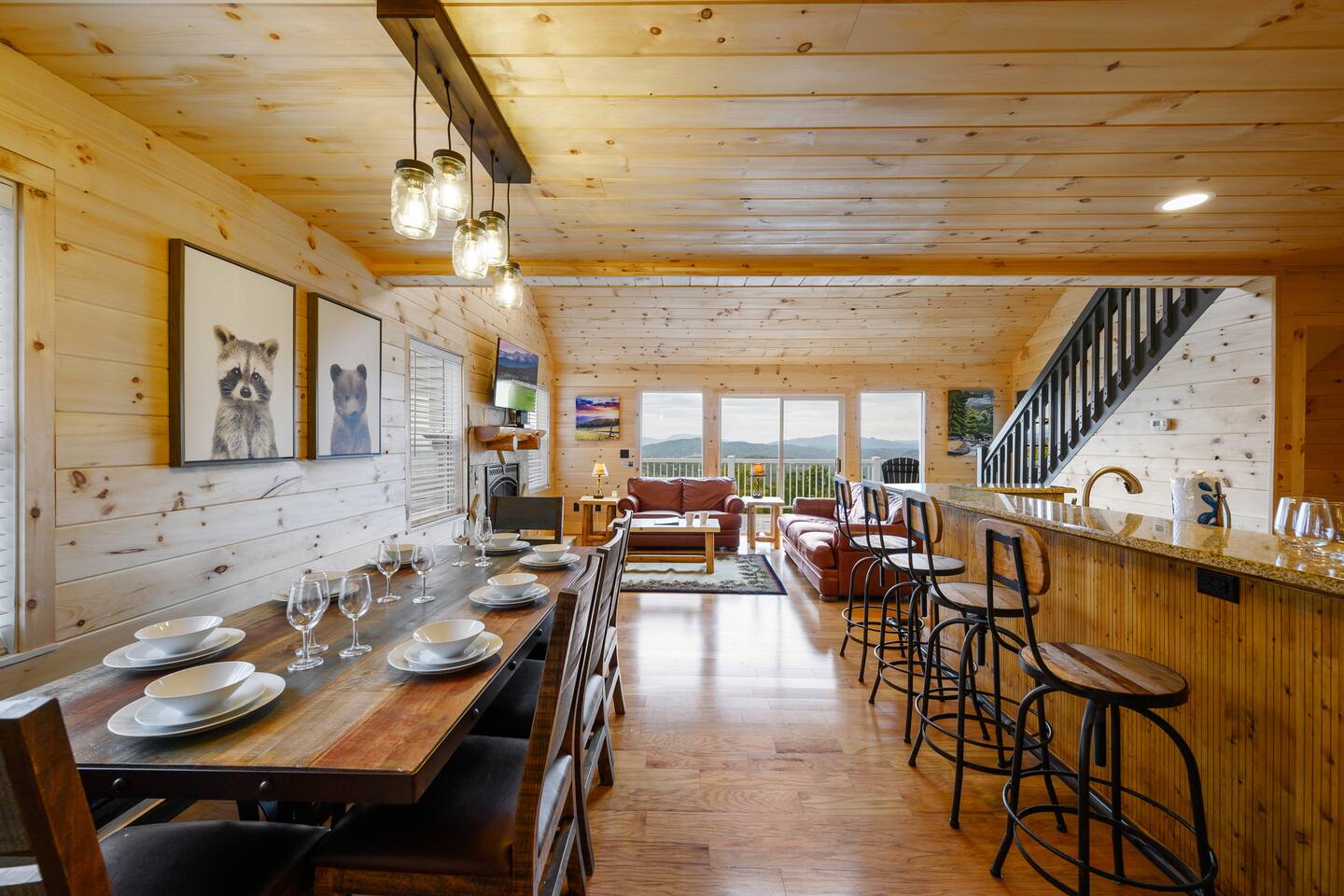 The chalet is in the premier community of Chalet Village, Gatlinburg, Tennessee and our property is adjacent to the Great Smoky Mountain National Park. The stunning views from the chalet of the Great Smoky Mountain National Park is breathtaking and we are only 2.4 miles from downtown Gatlinburg and the entrance to the Smoky Mountains National Park! Our close proximity to the Great Smoky Mountain National Park means there is lots of wildlife in our area - black bears, deer, wild turkeys, raccoons, coyotes, fox, and more! Black bears visit the chalet often in Spring, Summer and Fall. You may get lucky and catch a glimpse of one of these residents while enjoying the view from the deck. We also contract regular monthly pest services which treat for all pests from multiple types of bugs, mice, etc. Despite our regular treatments, given the proximity of the chalet to the park, it is possible these pests can temporarily enter the cabin. We immediately respond and treat if anything comes up and have found it is rare to come across anything like this. When you've had enough relaxation, look forward to endless entertainment in the surrounding area; you'll be in the perfect spot to explore through winding hiking trails and world-class ski slopes in the Great Smoky Mountains. Other local attractions can be found in downtown Gatlinburg, including delectable restaurants, intriguing shops, the always-entertaining alpine slides, and even a moonshine distillery! During your time here, make sure to visit the Ober Gatlinburg Amusement Park & Ski Area, which offers terrific skiing in the colder months, a ski mountain coaster, an aerial tramway, and many other thrilling attractions! The chalet is located on a mountain road. We strongly recommend trip insurance, especially during the Winter since there are no refunds for snow and ice. In difficult winter or storm related weather situations there can be delays in cleaning and check-in pending road conditions which can be outside of our control.