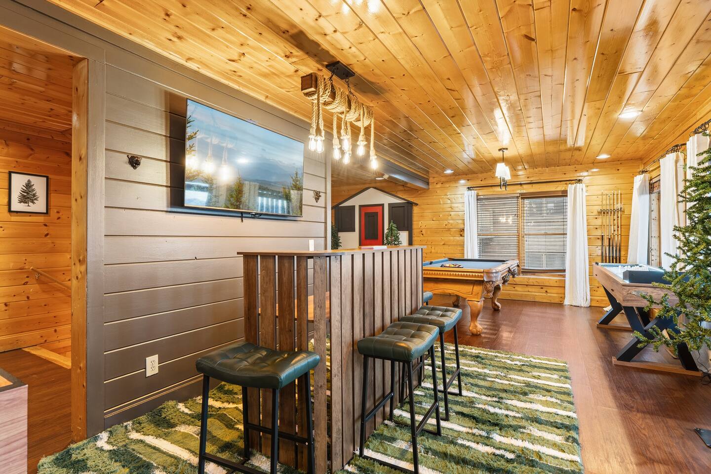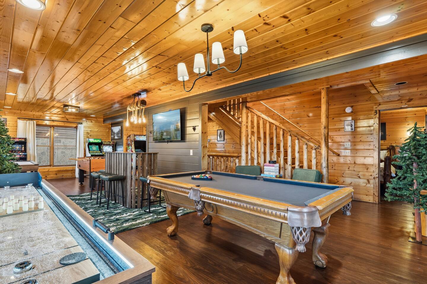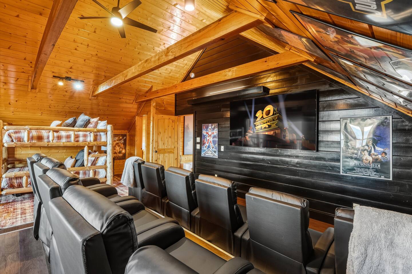 Plan your perfect spring escape at our cozy cabin, where fresh mountain air, blooming landscapes, and peaceful surroundings create the perfect setting for a relaxing getaway. Start your mornings on the porch with a cup of coffee, take in the sights and sounds of nature coming back to life, and unwind as the sun sets behind the mountains. Your springtime retreat is waiting. Come make it yours! We’re thrilled to welcome you to our newest cabin, Chapel Ridge at the Preserve! With years of experience hosting guests in the Smokies and over 2,000+ 5-star reviews across our properties, we’re committed to providing an exceptional stay. While this is a new account for properties we manage on behalf of friends and family, rest assured that your experience will be nothing short of spectacular. The open-concept living area is designed to bring everyone together, while still offering private spaces for quiet time. Cozy sofas and chairs surround a glowing fireplace, a large TV invites movie nights, and tasteful modern-rustic décor makes the cabin feel warm and welcoming. With room for 20 guests across multiple levels, there’s plenty of space for grandparents, parents, teens, and little ones to relax without feeling crowded. The second-floor game room is a hub of laughter and fun, featuring a pool table, foosball, shuffleboard and multiple arcade games its perfect for kids, teens, and adults alike. Share stories, play games, or simply unwind together after a day exploring the Smokies. On the top floor, you’ll find a dedicated private theater room, perfect for movie nights, rainy afternoons, or late-night popcorn-filled gatherings. With comfortable seating and a cinematic setup, it’s a favorite space for both kids and adults to relax and enjoy their favorite films together. Step outside to four spacious decks, each offering seating, serenity, and panoramic mountain views. The bottom-level deck is a family favorite, featuring a private hot tub, where everyone can unwind, soak, and watch the stars come out. Kids will love the space to play, adults will love the peace and views, and everyone will love the memories made together. Whether it’s bonding over games, cooking meals together, soaking in the hot tub, or exploring the mountains, this cabin provides everything a family needs for a magical, multi-generational getaway. But the experience doesn’t stop there. As a guest of our cabin, you'll also have access to the Preserve Resort’s world-class amenities, just a short walk from your front door. Enjoy a seasonal mountaintop pool with panoramic views, a scenic pavilion with a fireplace, and a charming wedding chapel. KITCHEN & Dining - The kitchen is a warm gathering place, spacious and fully equipped, with rich dark‑wood cabinetry, sleek stainless‑steel appliances, and plenty of counter space for cooking up group meals. Whether you're prepping a hearty breakfast before a hike or cooking a big family dinner, everything you need is right at hand. Adjacent to the kitchen, two large dining tables offer ample seating so everyone can dine together, celebrating the day, sharing stories, or playing late‑night card games. A kitchen bar with three extra seats adds flexibility and casual charm, perfect for coffee, wine, or late‑night snacks. OUTDOOR AREAS AND DECKS- Step outside and take a deep breath of fresh mountain air. Four spacious decks, each offering seating, serenity, and awe‑inspiring panoramic views of the Smokies. Picture sipping your morning coffee as fog rolls over the ridgelines, watching the sunset paint the mountains in gold, or stargazing under a clear night sky. The bottom‑level deck is a retreat all on its own, complete with a private hot tub. It’s the kind of spot where laughter lingers long after the sun goes down, and conversations flow between soak, views, and good company. RECREATION AREA - Let the good times roll in the second-floor game room, designed for laughter, friendly competition, and pure fun. Challenge family or friends to pool or foosball, or pick a multi-game arcade adventure. When it’s time to wind down, head up to the top-floor theater, featuring cozy seating that’s perfect for movie nights, binge-watching favorites, or relaxing after a day of adventure. These entertainment spaces are ideal for both high-energy evenings and laid-back lounging, making this retreat just as perfect for kids and teens as it is for adults ready to relax. Floor 1 • Hot tub • Full-sized washer and dryer Floor 2 • Game room with pool table, foosball, multi-game arcade, shuffleboard, outdoor bowling alley and more • Half Bathroom Main Level (Floor 3) • Kitchen & Large living room with TV and electric fireplace Top Floor (Floor 4) • Private Theater with Cozy seating BEDROOMS - Floor 1 • King bedroom with balcony • Jack and Jill bathroom connecting the king bedrooms with a tub/shower combo • King bedroom with balcony • Queen bedroom • Jack and Jill bathroom connecting the queen bedrooms with a tub/shower combo • Queen bedroom Floor 2 • Queen bedroom • Jack and Jill bathroom connecting the queen bedrooms with a tub/shower combo • Queen bedroom • Half Bathroom Main Level (Floor 3) • King bedroom with an ensuite bathroom, shower, and tub combo Top Floor (Floor 4) • 1 Full bunk bed & 1 King Bed in a loft bedroom • 1 full bunk bed in the home theatre room with an ensuite bathroom, a large tub and walk-in shower. ADDITIONAL AMENITIES – • Cozy Hot tub open year-round • HOA community pool open Memorial Day to Labor Day • Private Theater • Pool table, Foosball, Shuffleboard and Multigame arcade • High-speed Wi-Fi internet access • Washer and dryer available to use during your stay. • Heating & A/C • Parking for 5-6 standard-size vehicles. • We provide a set of starter supplies to allow you to get settled when you arrive. They include 2 trash bags, 2 dishwasher pods, a paper towel roll, a small liquid dish soap bottle, toile