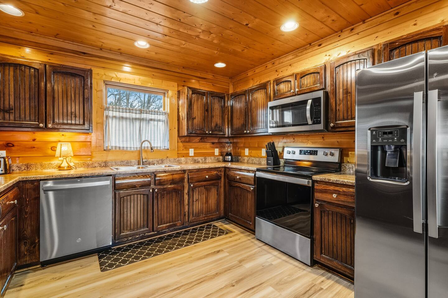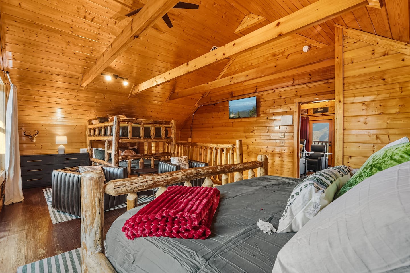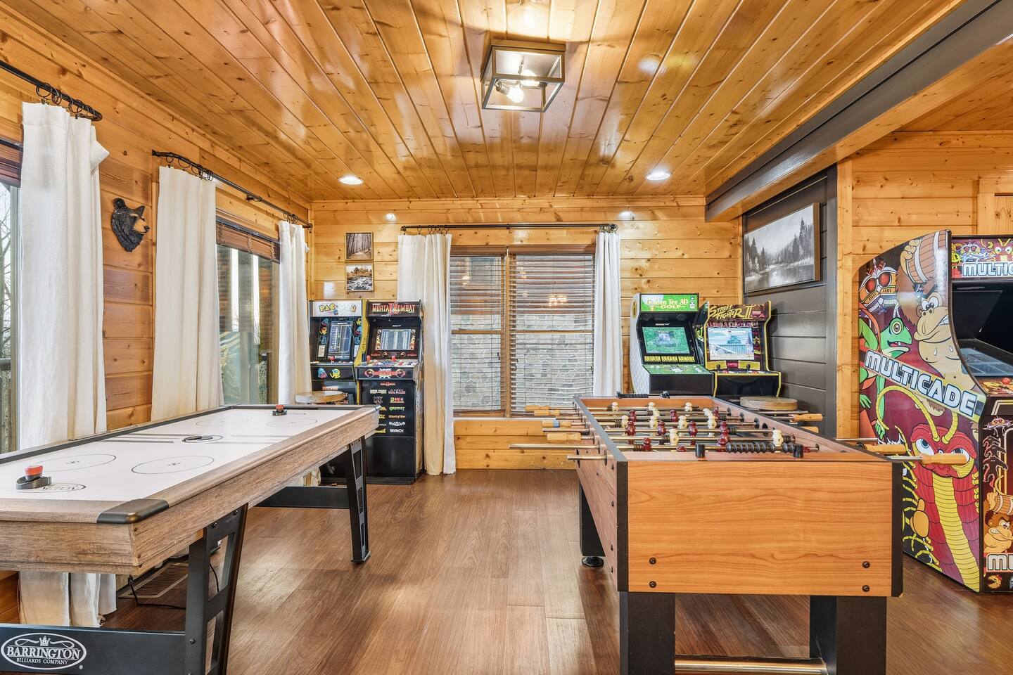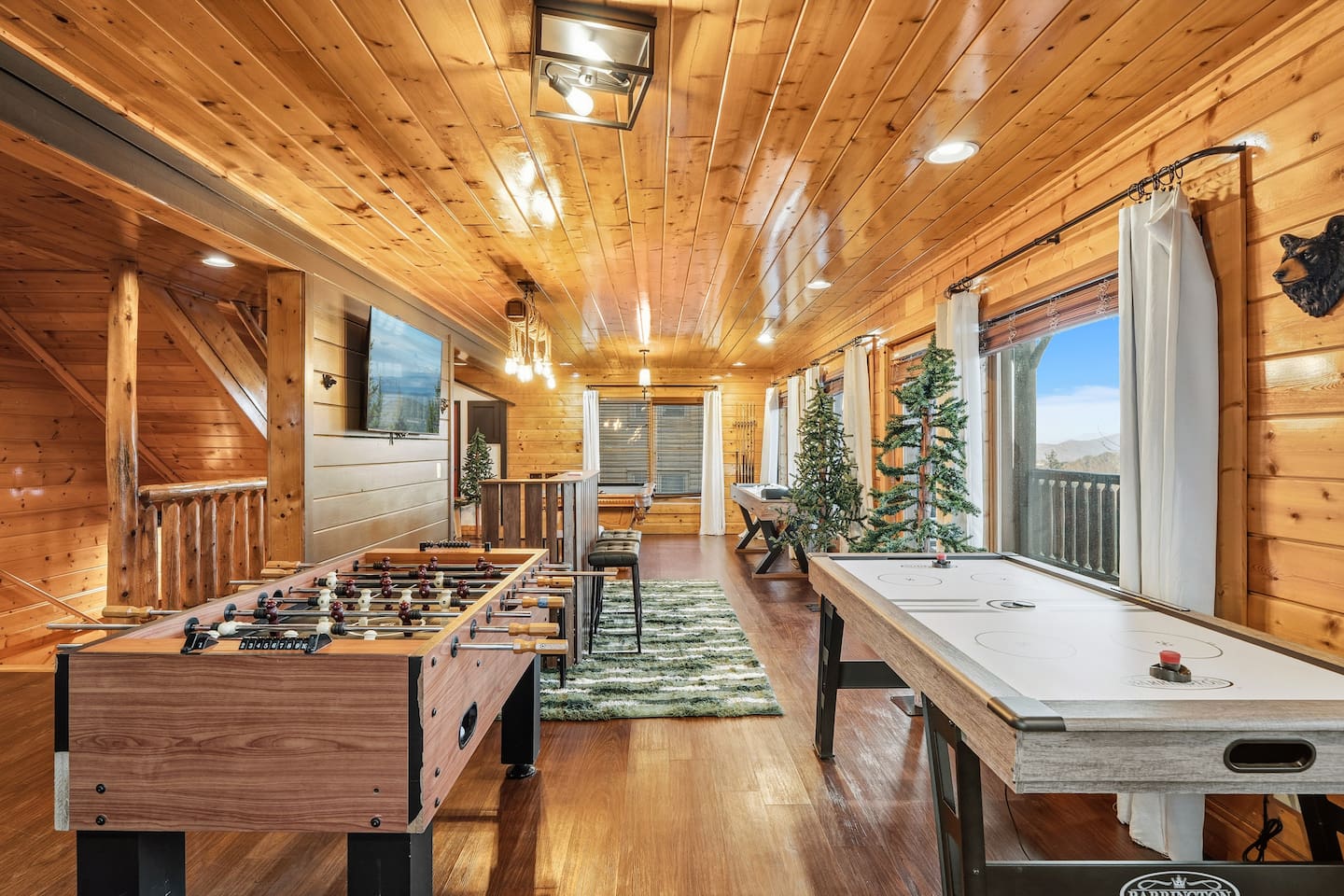Plan your perfect spring escape at our cozy cabin, where fresh mountain air, blooming landscapes, and peaceful surroundings create the perfect setting for a relaxing getaway. Start your mornings on the porch with a cup of coffee, take in the sights and sounds of nature coming back to life, and unwind as the sun sets behind the mountains. Your springtime retreat is waiting. Come make it yours! We’re thrilled to welcome you to our newest cabin, Chapel Ridge at the Preserve! With years of experience hosting guests in the Smokies and over 2,000+ 5-star reviews across our properties, we’re committed to providing an exceptional stay. While this is a new account for properties we manage on behalf of friends and family, rest assured that your experience will be nothing short of spectacular. The open-concept living area is designed to bring everyone together, while still offering private spaces for quiet time. Cozy sofas and chairs surround a glowing fireplace, a large TV invites movie nights, and tasteful modern-rustic décor makes the cabin feel warm and welcoming. With room for 20 guests across multiple levels, there’s plenty of space for grandparents, parents, teens, and little ones to relax without feeling crowded. The second-floor game room is a hub of laughter and fun, featuring a pool table, foosball, shuffleboard and multiple arcade games its perfect for kids, teens, and adults alike. Share stories, play games, or simply unwind together after a day exploring the Smokies. On the top floor, you’ll find a dedicated private theater room, perfect for movie nights, rainy afternoons, or late-night popcorn-filled gatherings. With comfortable seating and a cinematic setup, it’s a favorite space for both kids and adults to relax and enjoy their favorite films together. Step outside to four spacious decks, each offering seating, serenity, and panoramic mountain views. The bottom-level deck is a family favorite, featuring a private hot tub, where everyone can unwind, soak, and watch the stars come out. Kids will love the space to play, adults will love the peace and views, and everyone will love the memories made together. Whether it’s bonding over games, cooking meals together, soaking in the hot tub, or exploring the mountains, this cabin provides everything a family needs for a magical, multi-generational getaway. But the experience doesn’t stop there. As a guest of our cabin, you'll also have access to the Preserve Resort’s world-class amenities, just a short walk from your front door. Enjoy a seasonal mountaintop pool with panoramic views, a scenic pavilion with a fireplace, and a charming wedding chapel. KITCHEN & Dining - The kitchen is a warm gathering place, spacious and fully equipped, with rich dark‑wood cabinetry, sleek stainless‑steel appliances, and plenty of counter space for cooking up group meals. Whether you're prepping a hearty breakfast before a hike or cooking a big family dinner, everything you need is right at hand. Adjacent to the kitchen, two large dining tables offer ample seating so everyone can dine together, celebrating the day, sharing stories, or playing late‑night card games. A kitchen bar with three extra seats adds flexibility and casual charm, perfect for coffee, wine, or late‑night snacks. OUTDOOR AREAS AND DECKS- Step outside and take a deep breath of fresh mountain air. Four spacious decks, each offering seating, serenity, and awe‑inspiring panoramic views of the Smokies. Picture sipping your morning coffee as fog rolls over the ridgelines, watching the sunset paint the mountains in gold, or stargazing under a clear night sky. The bottom‑level deck is a retreat all on its own, complete with a private hot tub. It’s the kind of spot where laughter lingers long after the sun goes down, and conversations flow between soak, views, and good company. RECREATION AREA - Let the good times roll in the second-floor game room, designed for laughter, friendly competition, and pure fun. Challenge family or friends to pool or foosball, or pick a multi-game arcade adventure. When it’s time to wind down, head up to the top-floor theater, featuring cozy seating that’s perfect for movie nights, binge-watching favorites, or relaxing after a day of adventure. These entertainment spaces are ideal for both high-energy evenings and laid-back lounging, making this retreat just as perfect for kids and teens as it is for adults ready to relax. Floor 1 • Hot tub • Full-sized washer and dryer Floor 2 • Game room with pool table, foosball, multi-game arcade, shuffleboard, outdoor bowling alley and more • Half Bathroom Main Level (Floor 3) • Kitchen & Large living room with TV and electric fireplace Top Floor (Floor 4) • Private Theater with Cozy seating BEDROOMS - Floor 1 • King bedroom with balcony • Jack and Jill bathroom connecting the king bedrooms with a tub/shower combo • King bedroom with balcony • Queen bedroom • Jack and Jill bathroom connecting the queen bedrooms with a tub/shower combo • Queen bedroom Floor 2 • Queen bedroom • Jack and Jill bathroom connecting the queen bedrooms with a tub/shower combo • Queen bedroom • Half Bathroom Main Level (Floor 3) • King bedroom with an ensuite bathroom, shower, and tub combo Top Floor (Floor 4) • 1 Full bunk bed & 1 King Bed in a loft bedroom • 1 full bunk bed in the home theatre room with an ensuite bathroom, a large tub and walk-in shower. ADDITIONAL AMENITIES – • Cozy Hot tub open year-round • HOA community pool open Memorial Day to Labor Day • Private Theater • Pool table, Foosball, Shuffleboard and Multigame arcade • High-speed Wi-Fi internet access • Washer and dryer available to use during your stay. • Heating & A/C • Parking for 5-6 standard-size vehicles. • We provide a set of starter supplies to allow you to get settled when you arrive. They include 2 trash bags, 2 dishwasher pods, a paper towel roll, a small liquid dish soap bottle, toile